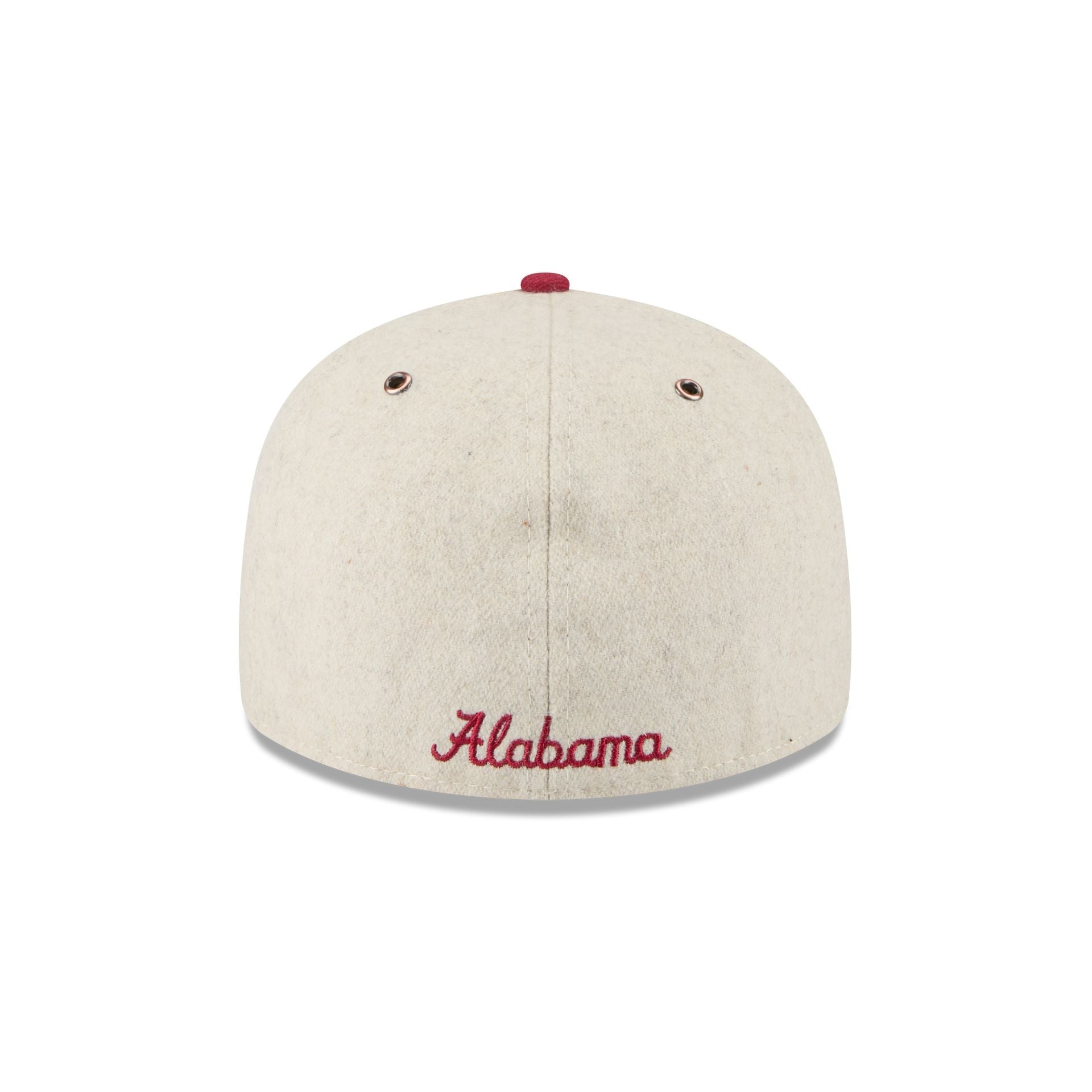The Alabama Crimson Tide College Vault Wool Letterman Retro Crown 59FIFTY Fitted Cap features an embroidered loop Crimson Tide College Vault logo at the front panels and an additional logo at the rear. Additional details include a wool fabrication throughout the cap and a gray undervisor.