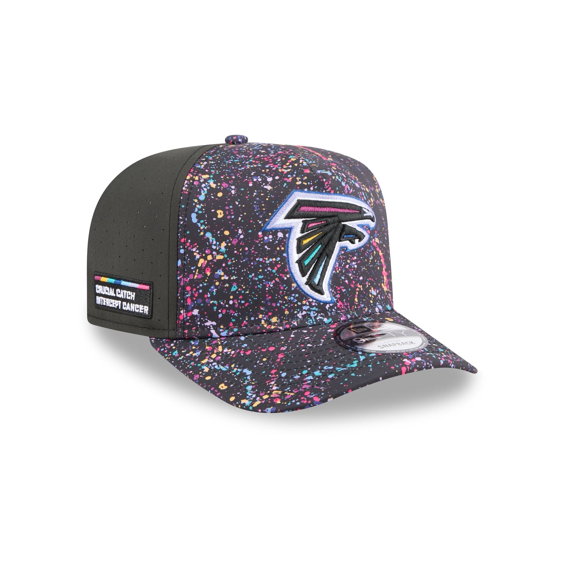 The Atlanta Falcons 2025 Crucial Catch 9FIFTY A-Frame Snapback features an embroidered Falcons logo at the front paint splatter panels with a woven NFL Shield tag above a snapback closure at the rear. Additional details include a Crucial Catch Intercept Cancer patch at the right-wear side and a black undervisor.