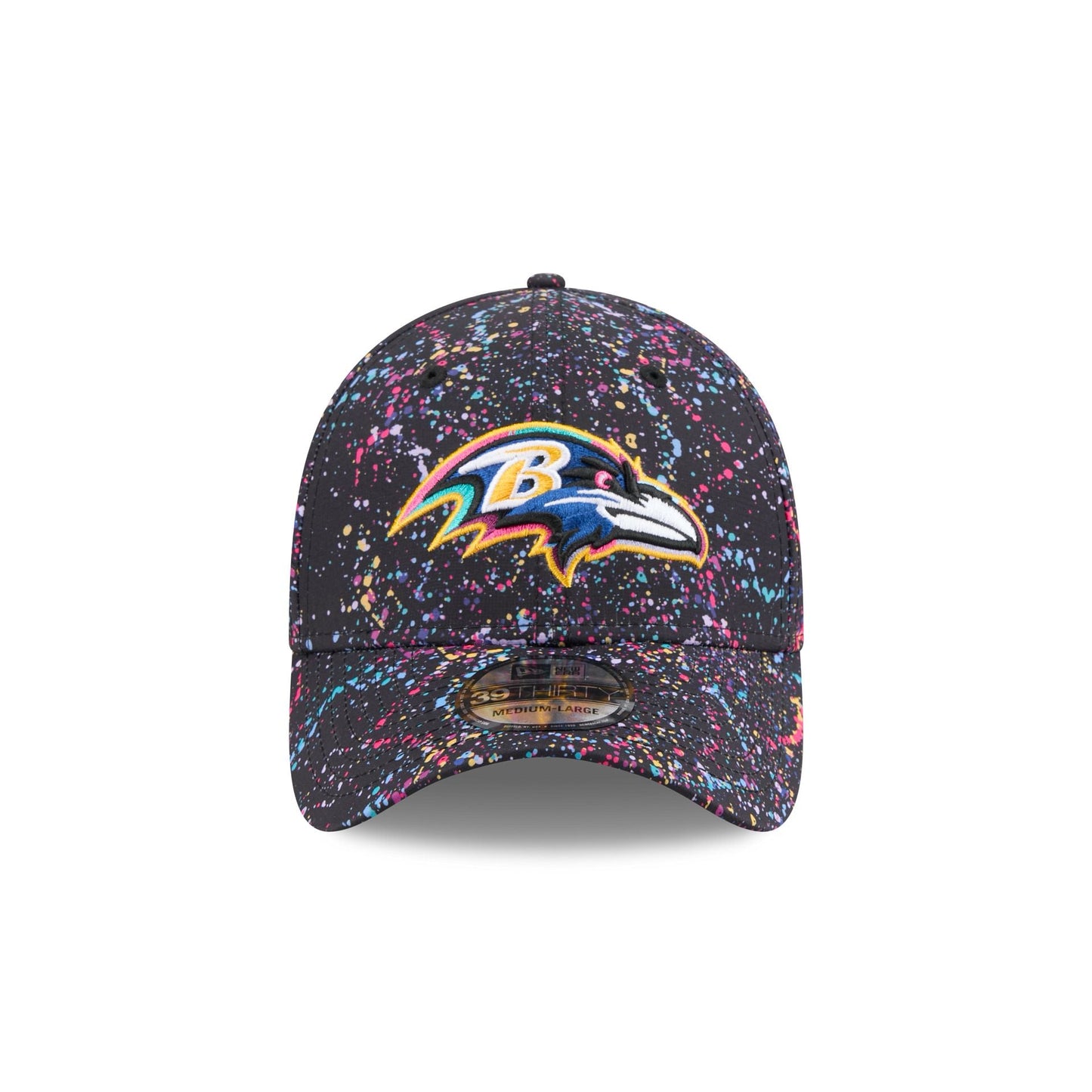 The Baltimore Ravens 2025 Crucial Catch 39THIRTY Stretch Fit Cap features an embroidered Ravens logo at the front paint splatter panels with an NFL Shield at the rear, a Crucial Catch Intercept Cancer patch at the right-wear side, and a black undervisor.