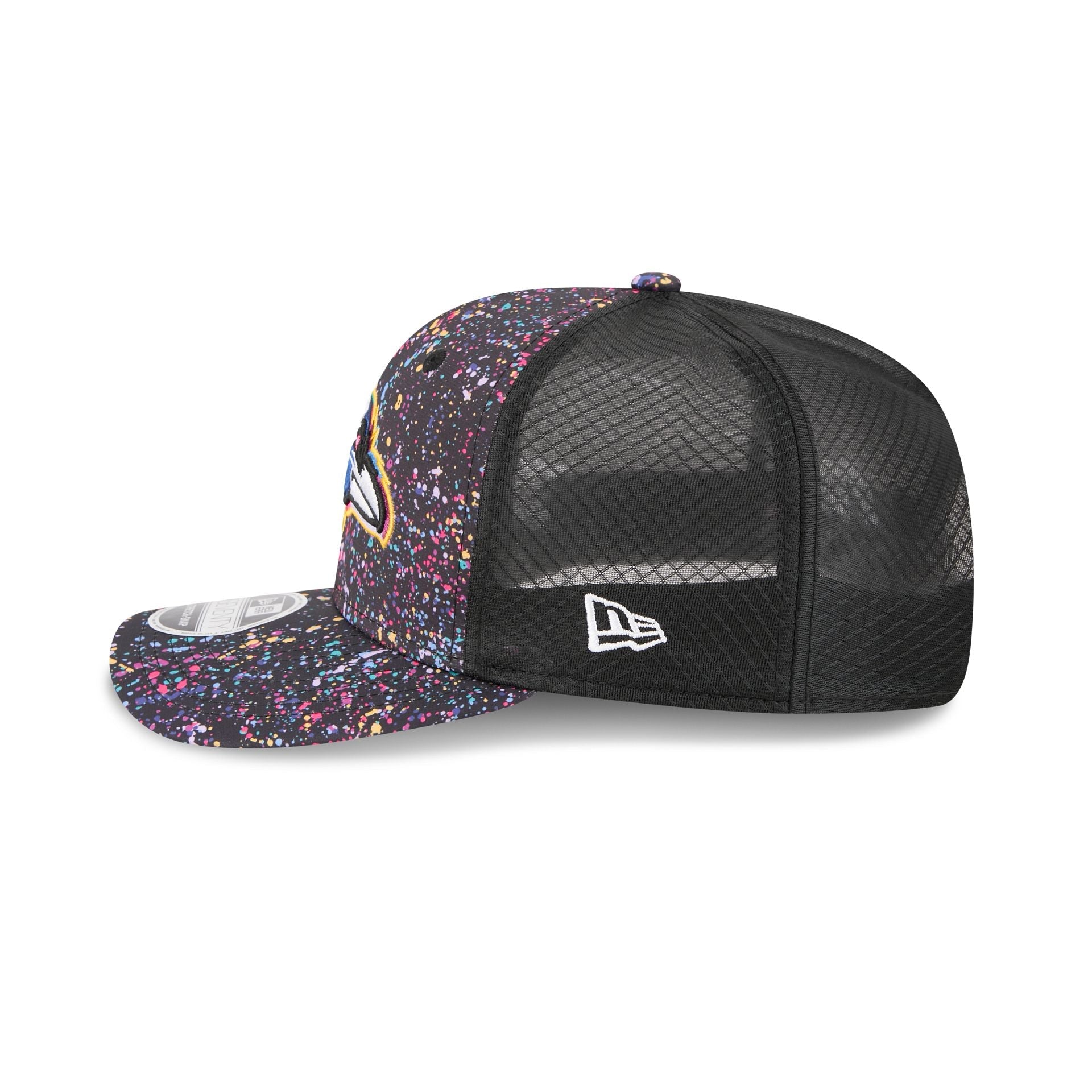 The Baltimore Ravens 2025 Crucial Catch 9SEVENTY Trucker features an embroidered Ravens logo at the front paint splatter panels with a woven NFL Shield tag above a snapback closure at the rear. Additional details include a Crucial Catch Intercept Cancer patch at the right-wear side with performance mesh rear panels and a black undervisor.