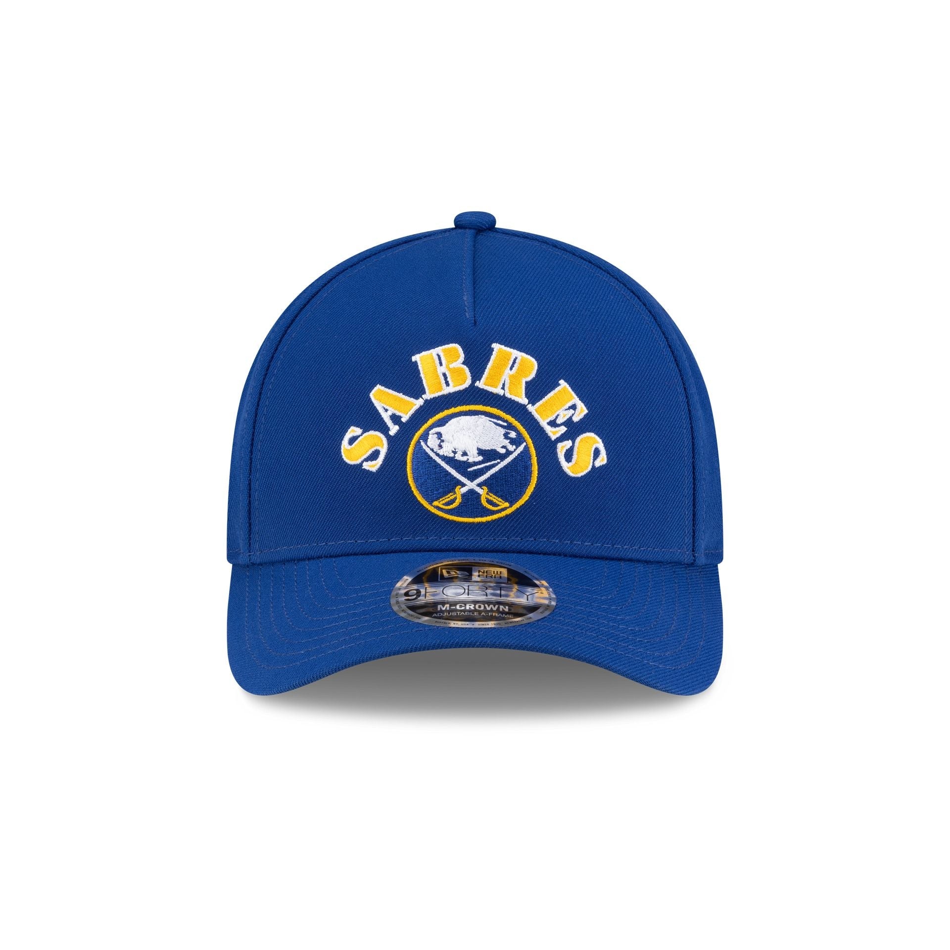The Buffalo Sabres Retro Arch 9FORTY M-Crown A-Frame Snapback features an embroidered Sabres arched wordmark and logo at the front panels with the NHL Shield above an adjustable snapback closure at the rear and a gray undervisor.