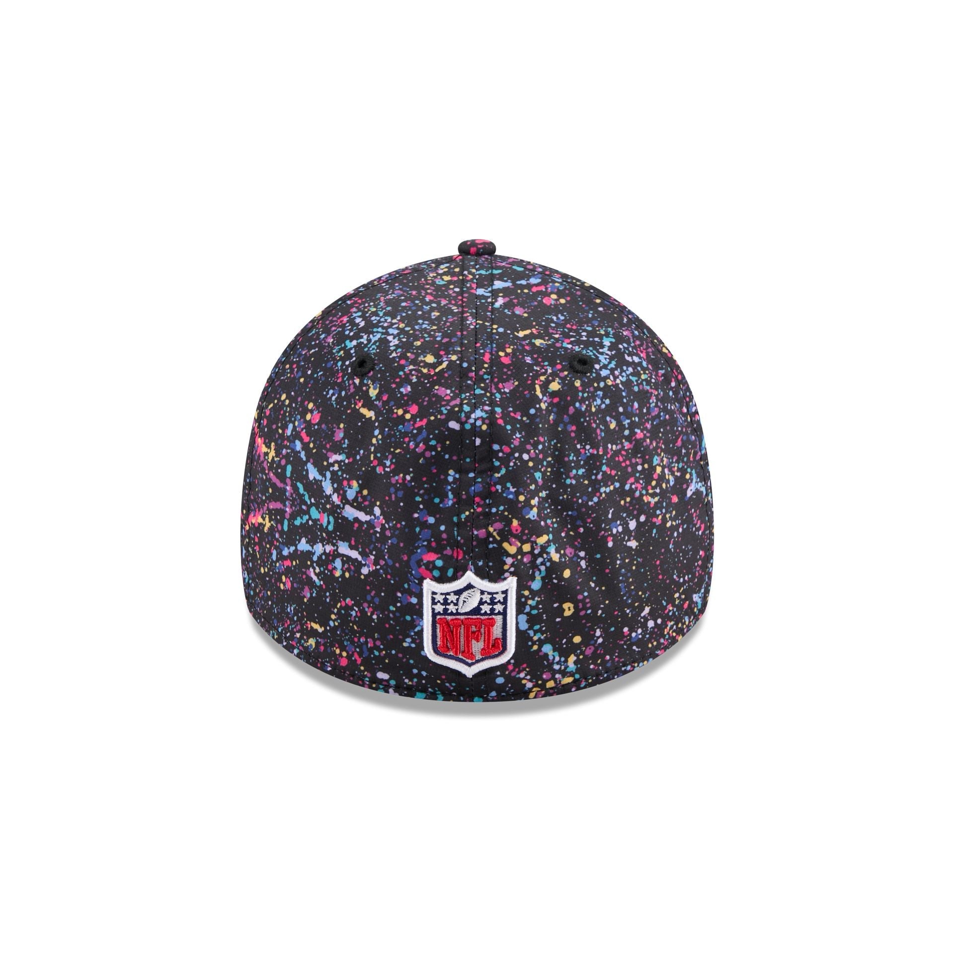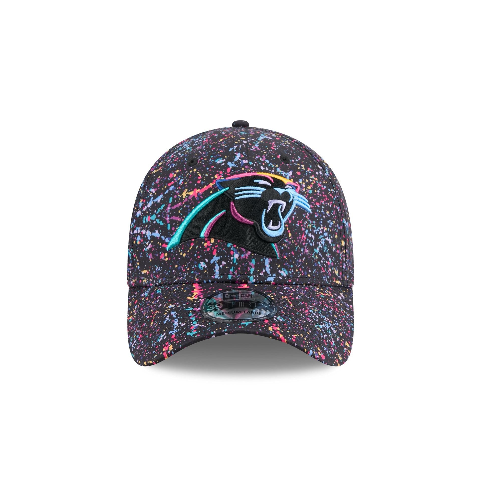 The Carolina Panthers 2025 Crucial Catch 39THIRTY Stretch Fit Cap features an embroidered Panthers logo at the front paint splatter panels with an NFL Shield at the rear, a Crucial Catch Intercept Cancer patch at the right-wear side, and a black undervisor.
