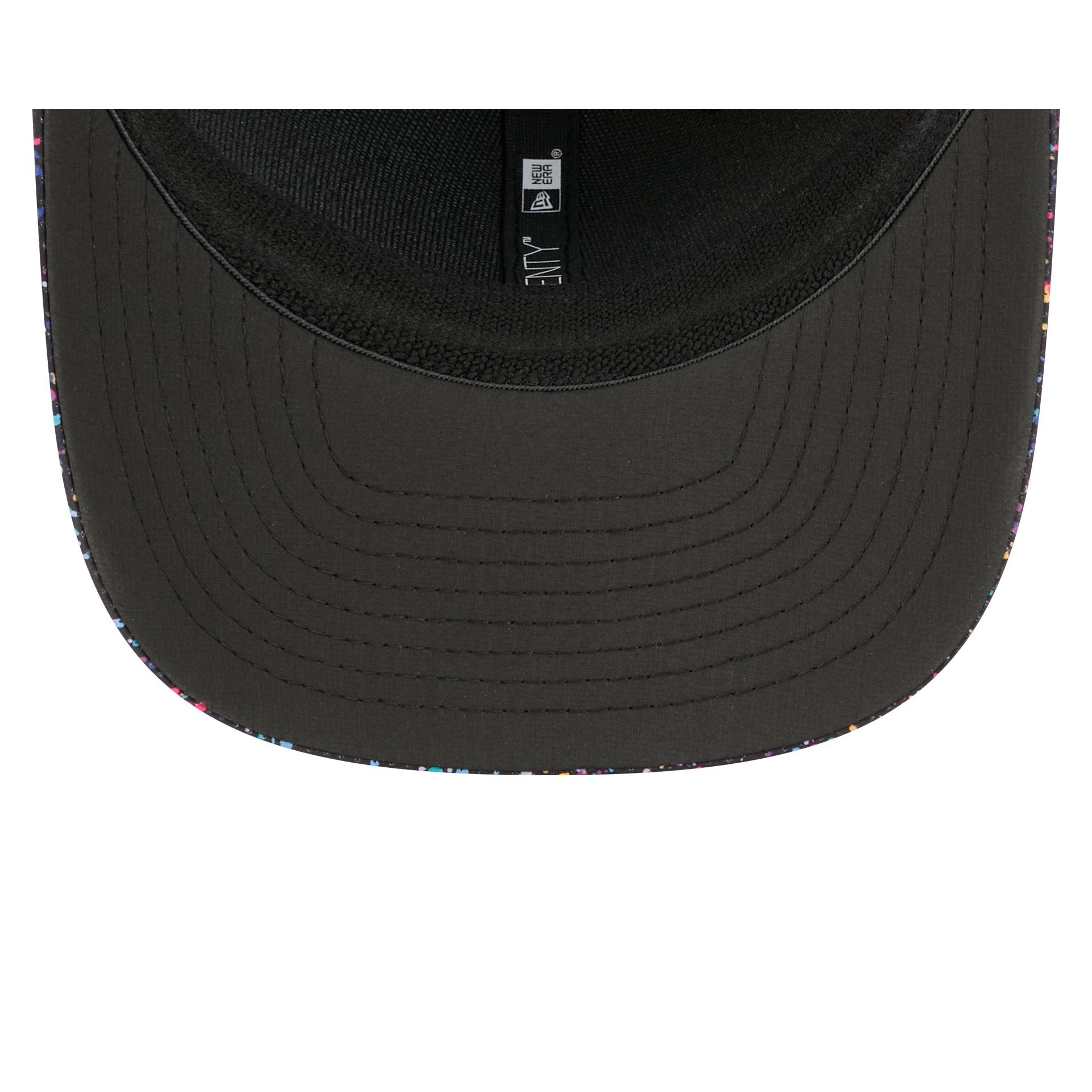 The Carolina Panthers 2025 Crucial Catch 9SEVENTY Trucker features an embroidered Panthers logo at the front paint splatter panels with a woven NFL Shield tag above a snapback closure at the rear. Additional details include a Crucial Catch Intercept Cancer patch at the right-wear side with performance mesh rear panels and a black undervisor.