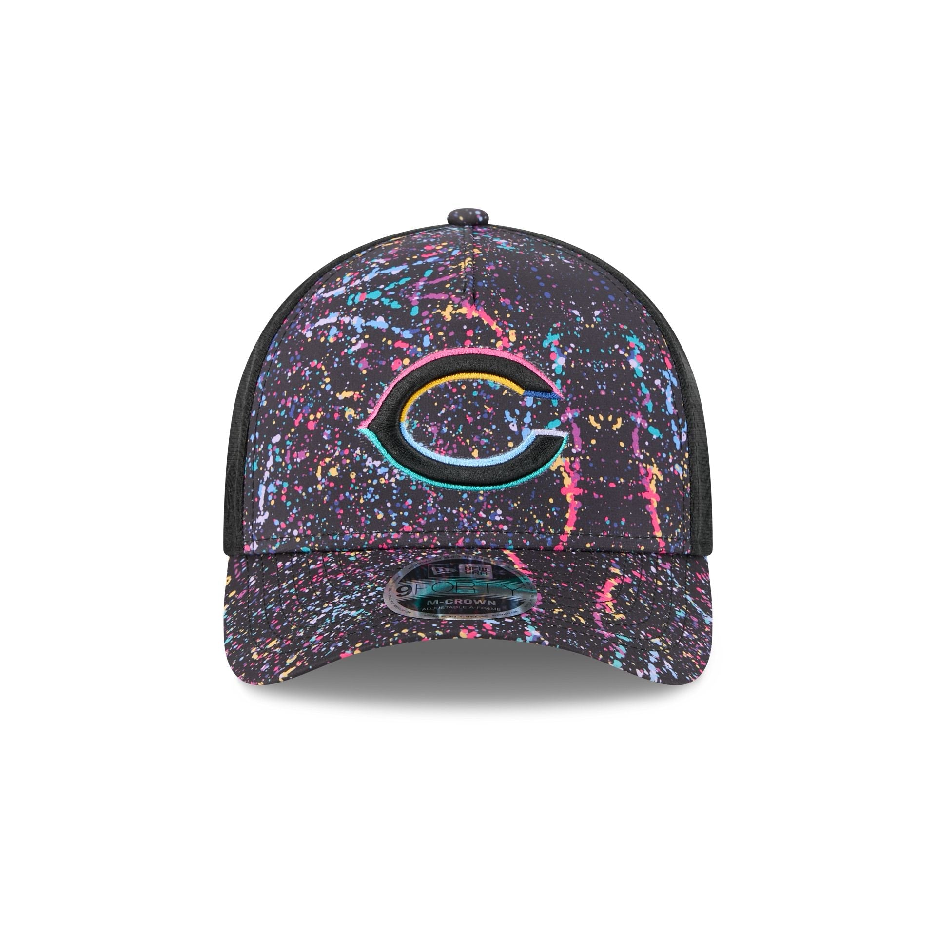 The Chicago Bears 2025 Crucial Catch 9FORTY M-Crown A-Frame Trucker features an embroidered Bears logo at the front paint splatter panels with a woven NFL Shield tag above a snapback closure and a GSH logo at the rear. Additional details include a Crucial Catch Intercept Cancer patch at the right-wear side with performance mesh rear panels and a black undervisor.