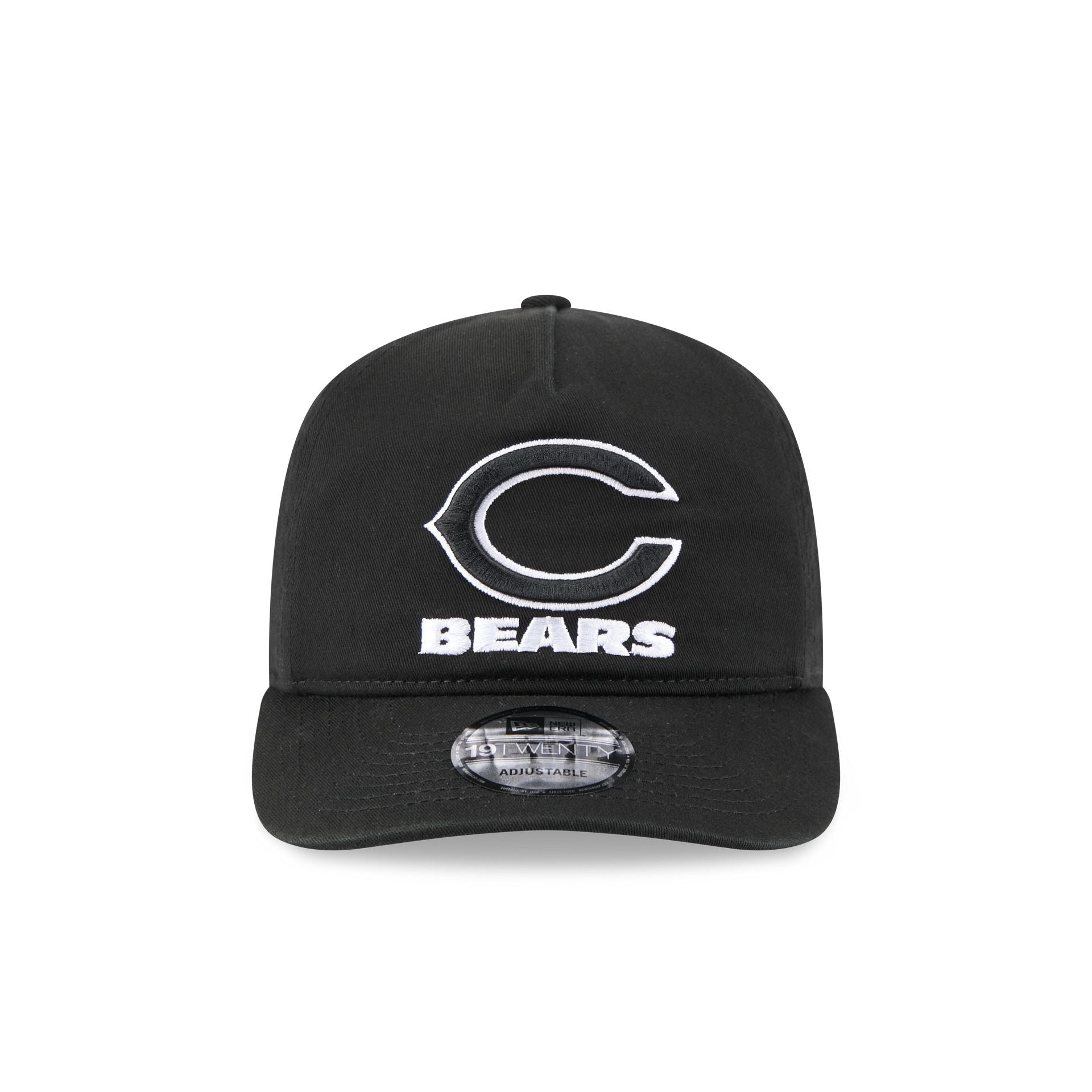 The Chicago Bears Black and White 19TWENTY Snapback features an embroidered Bears logo at the front with a snapback closure at the rear and a gray undervisor.