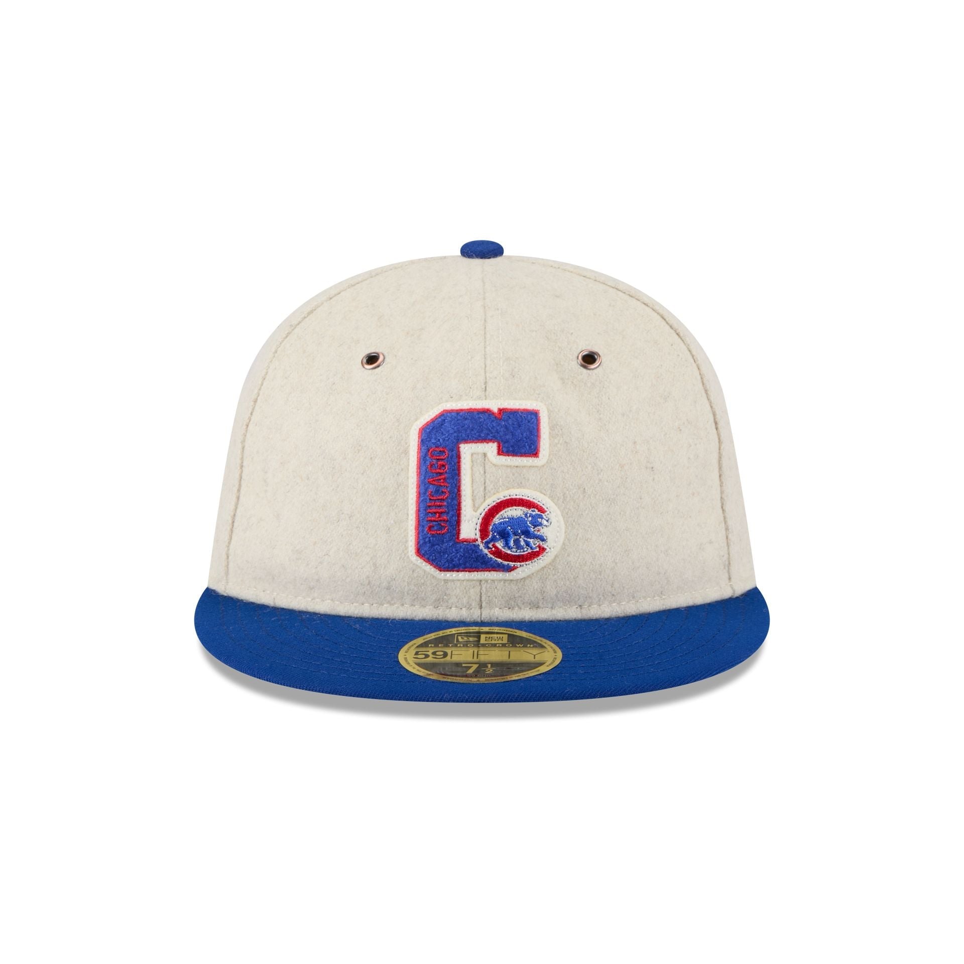The Chicago Cubs Wool Letterman Retro Crown 59FIFTY Fitted Cap features an embroidered loop Cubs logo at the front panels and an additional logo at the rear. Additional details include a wool fabrication throughout the cap and a gray undervisor.