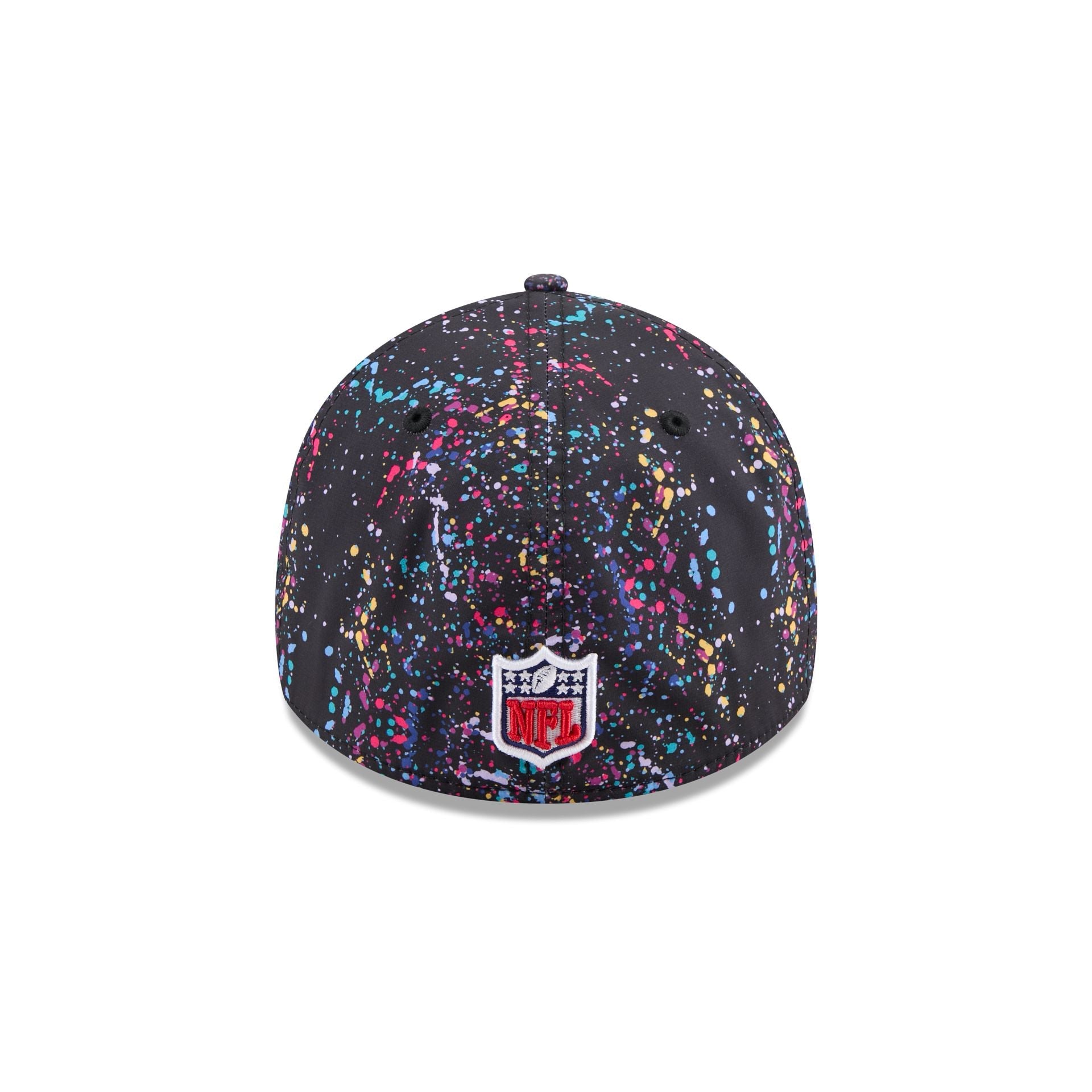 The Cleveland Browns 2025 Crucial Catch 39THIRTY Stretch Fit Cap features an embroidered Browns logo at the front paint splatter panels with an NFL Shield at the rear, a Crucial Catch Intercept Cancer patch at the right-wear side, and a black undervisor.