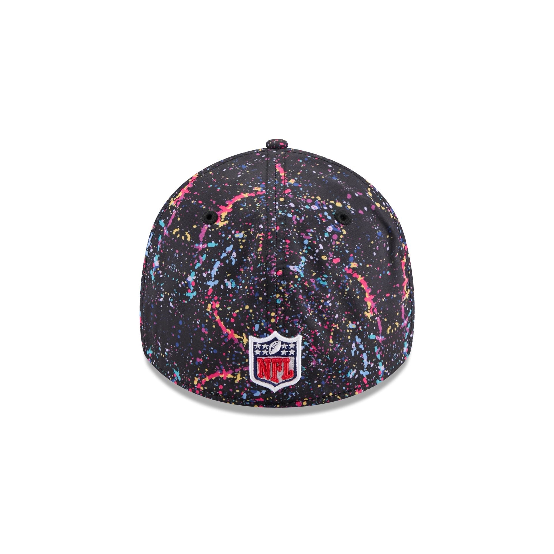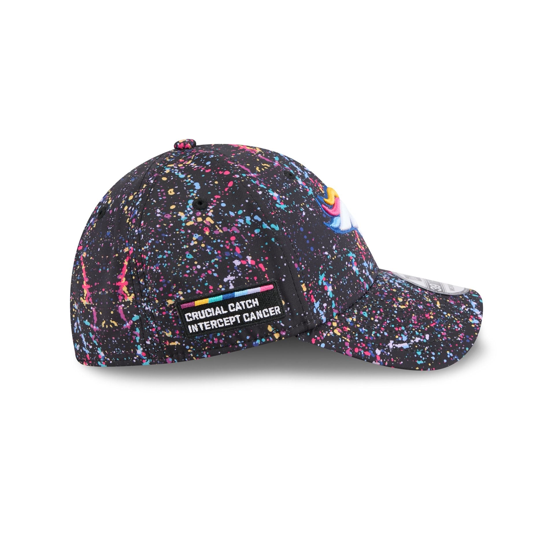 The Denver Broncos 2025 Crucial Catch 39THIRTY Stretch Fit Cap features an embroidered Broncos logo at the front paint splatter panels with an NFL Shield at the rear, a Crucial Catch Intercept Cancer patch at the right-wear side, and a black undervisor.