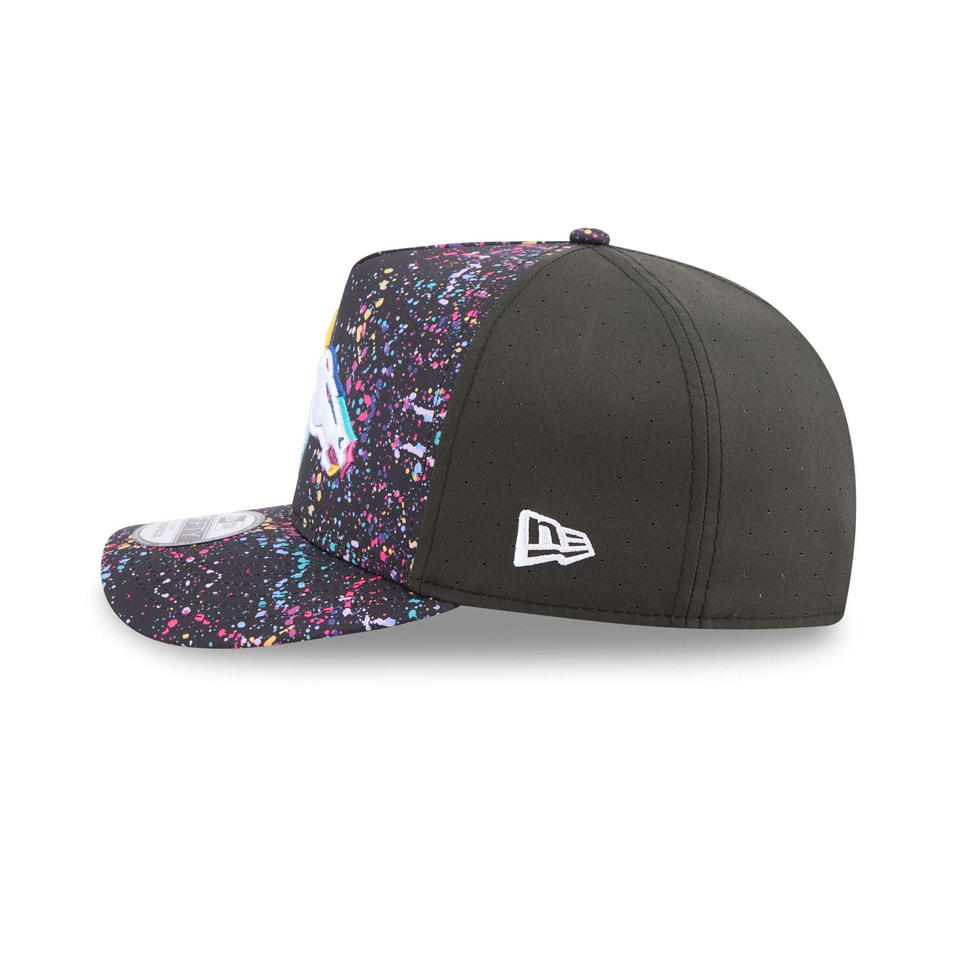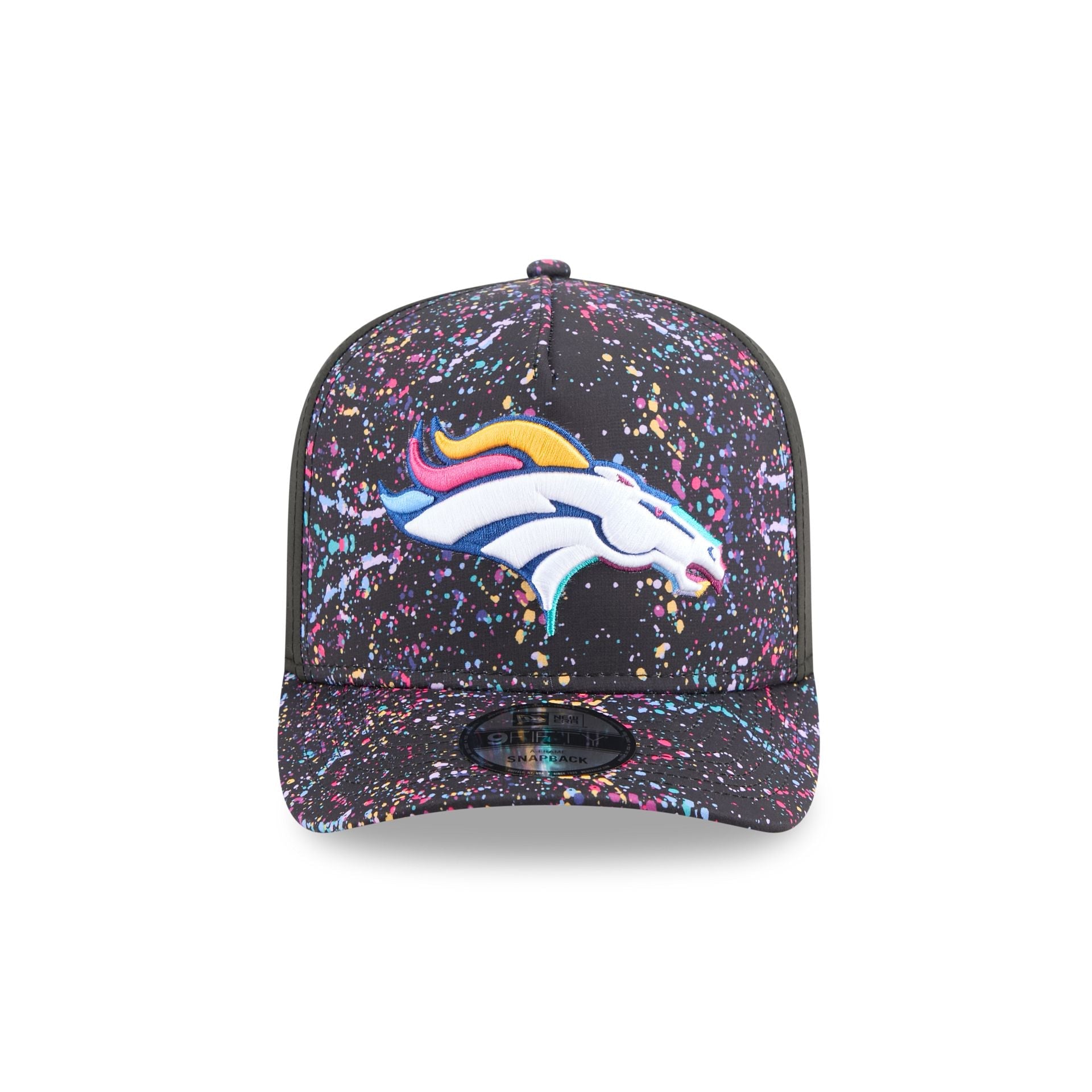 The Denver Broncos 2025 Crucial Catch 9FIFTY A-Frame Snapback features an embroidered Broncos logo at the front paint splatter panels with a woven NFL Shield tag above a snapback closure at the rear. Additional details include a Crucial Catch Intercept Cancer patch at the right-wear side and a black undervisor.