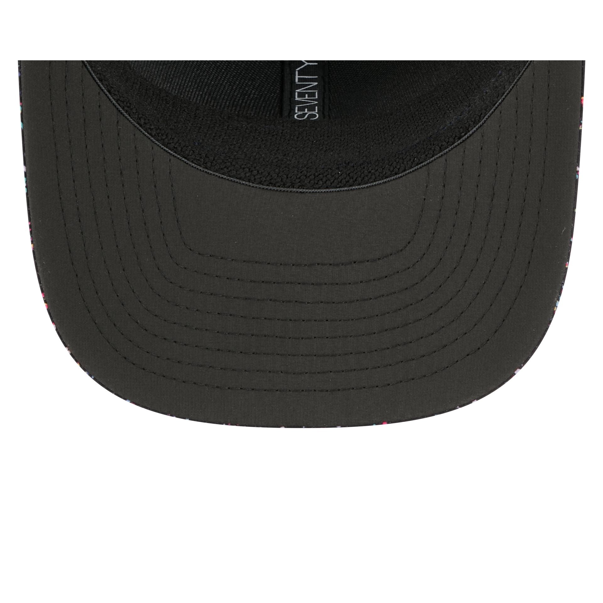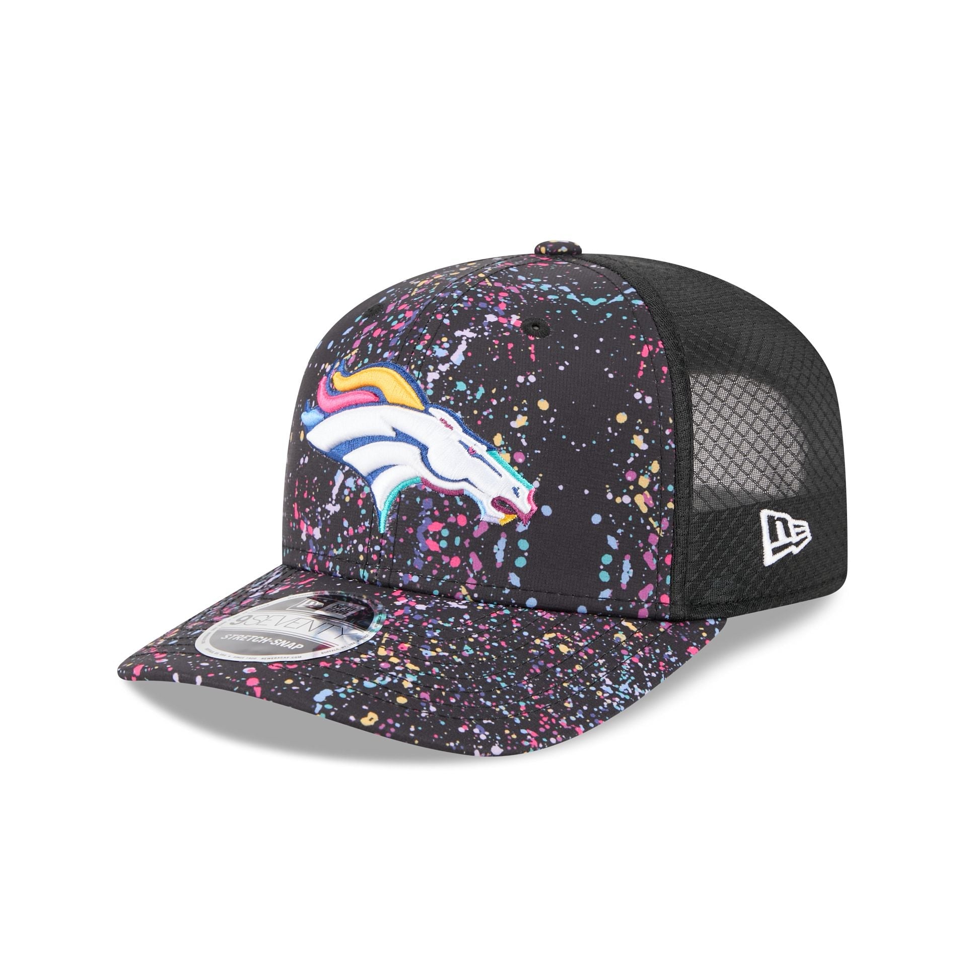 The Denver Broncos 2025 Crucial Catch 9SEVENTY Trucker features an embroidered Broncos logo at the front paint splatter panels with a woven NFL Shield tag above a snapback closure at the rear. Additional details include a Crucial Catch Intercept Cancer patch at the right-wear side with performance mesh rear panels and a black undervisor.