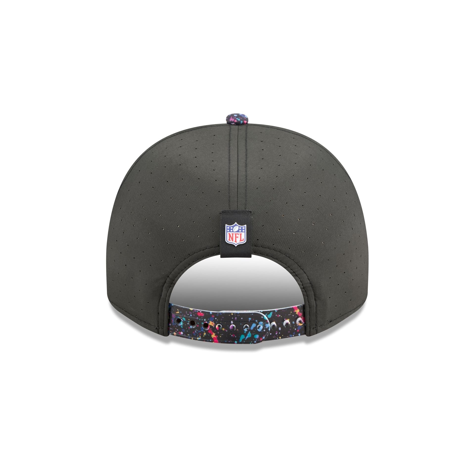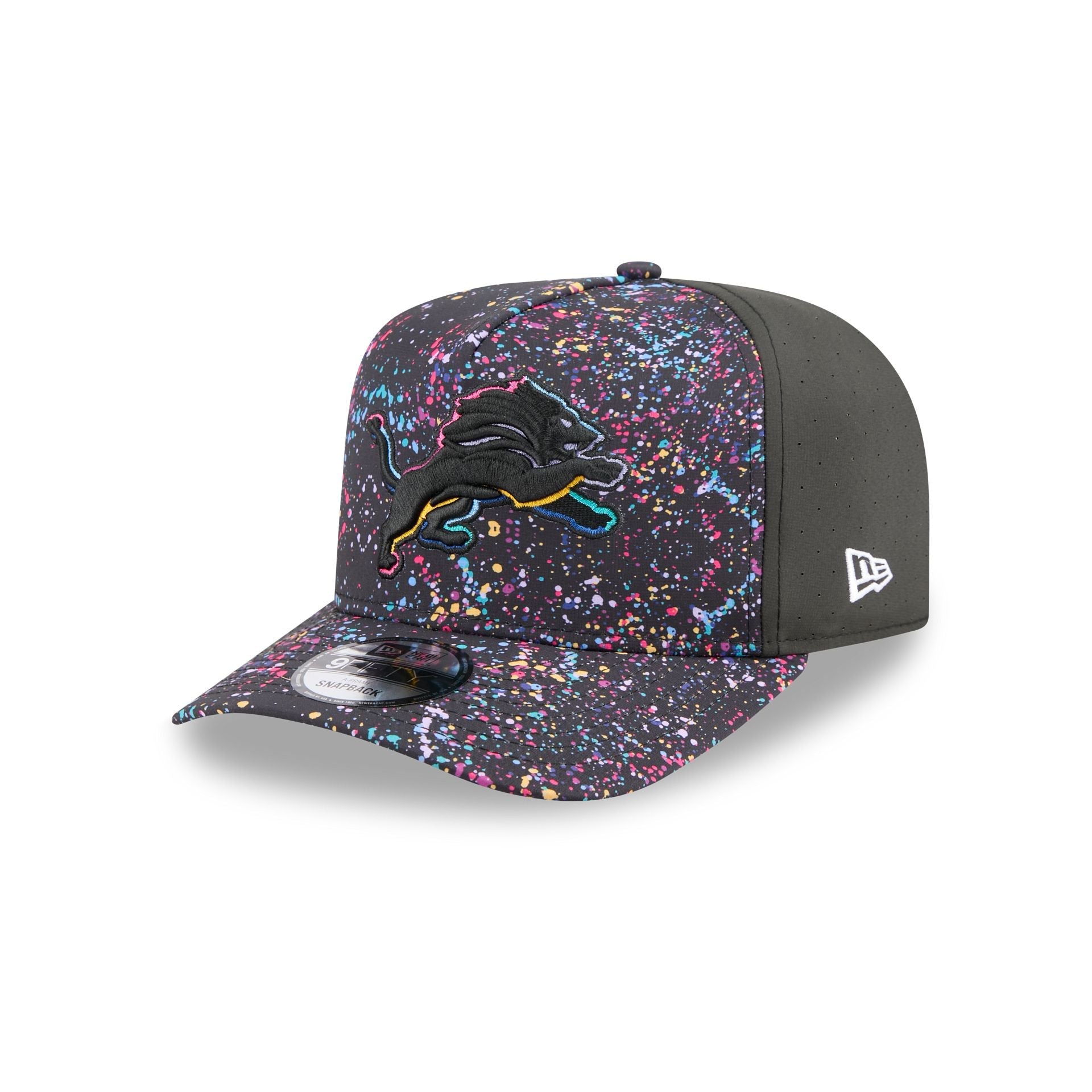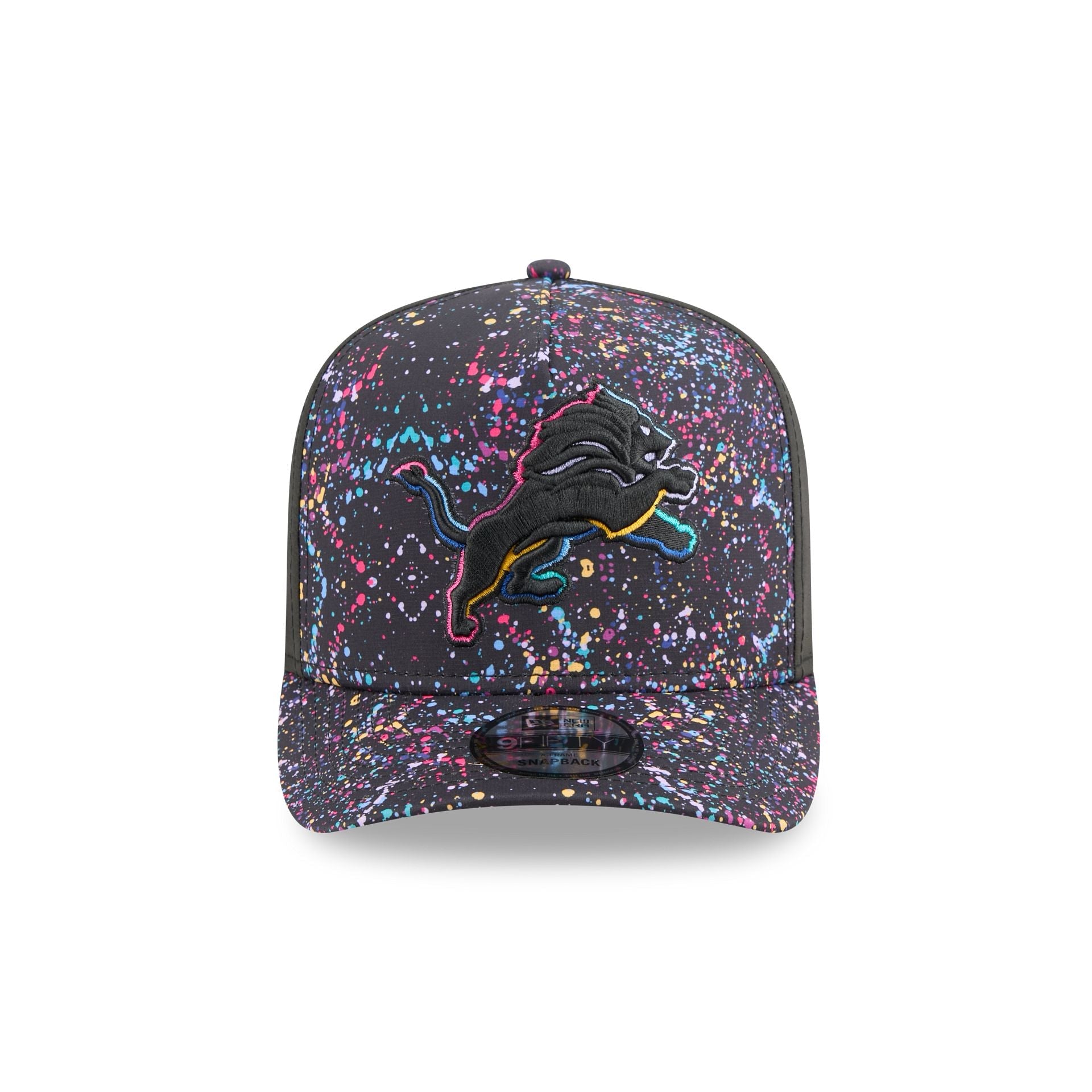 The Detroit Lions 2025 Crucial Catch 9FIFTY A-Frame Snapback features an embroidered Lions logo at the front paint splatter panels with a woven NFL Shield tag above a snapback closure at the rear. Additional details include a Crucial Catch Intercept Cancer patch at the right-wear side and a black undervisor.