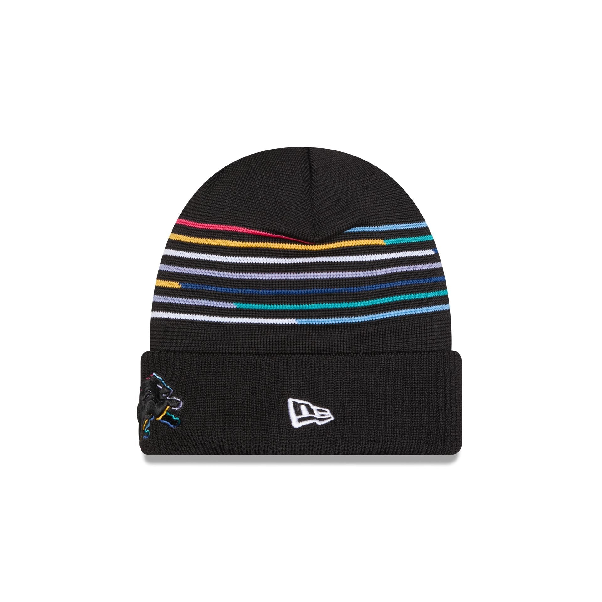 The Detroit Lions 2025 Crucial Catch Cuff Knit features an embroidered Lions logo at the front with matching colored stripes at the crown, an NFL Shield at the rear, and a Crucial Catch Intercept Cancer patch at the right-wear side.