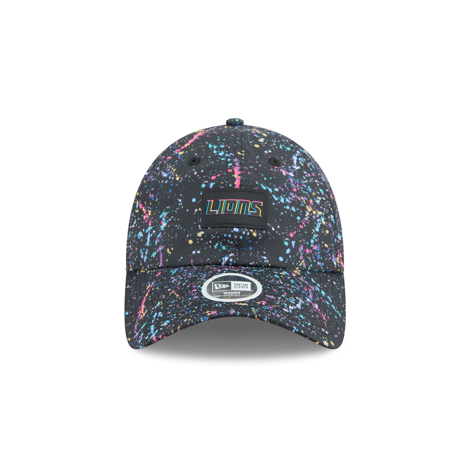 The Detroit Lions 2025 Crucial Catch Women's Open Back Adjustable Cap features a woven Lions logo at the front paint splatter panels with a woven NFL Shield tag at the adjustable strapback closure at the rear. Additional details include a Crucial Catch Intercept Cancer patch at the right-wear side with a black undervisor.