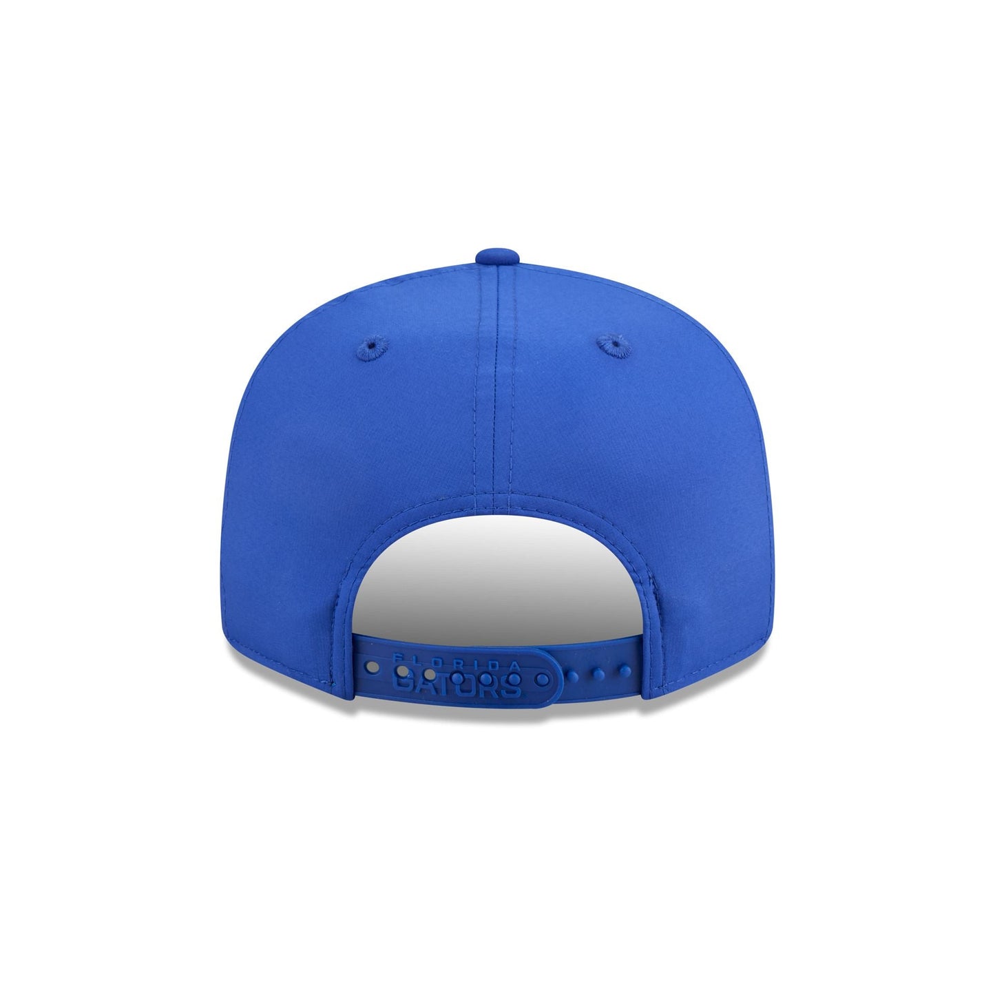 The Florida Gators Hot Weather Split Panel 9FIFTY Snapback features a sewn-down silicone Gators logo patch at the front panels with a split-crown construction featuring water-repellent quill tech fabrication. Additional details include a team wordmark at a soft silicone snapback closure at the rear with a quick-dry cushioned sweatband to absorb moisture and team color silicone transfer details at the undervisor.