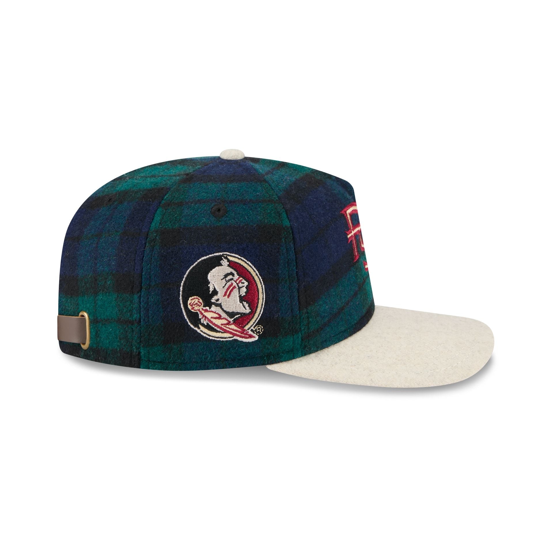 The Florida State Seminoles Plaid Letterman 19TWENTY Adjustable Cap features an embroidered Seminoles logo at the front panels against a wool plaid fabrication throughout the cap. Additional details include a team circle patch at the right-wear side and adjustable leather closure at the rear.
