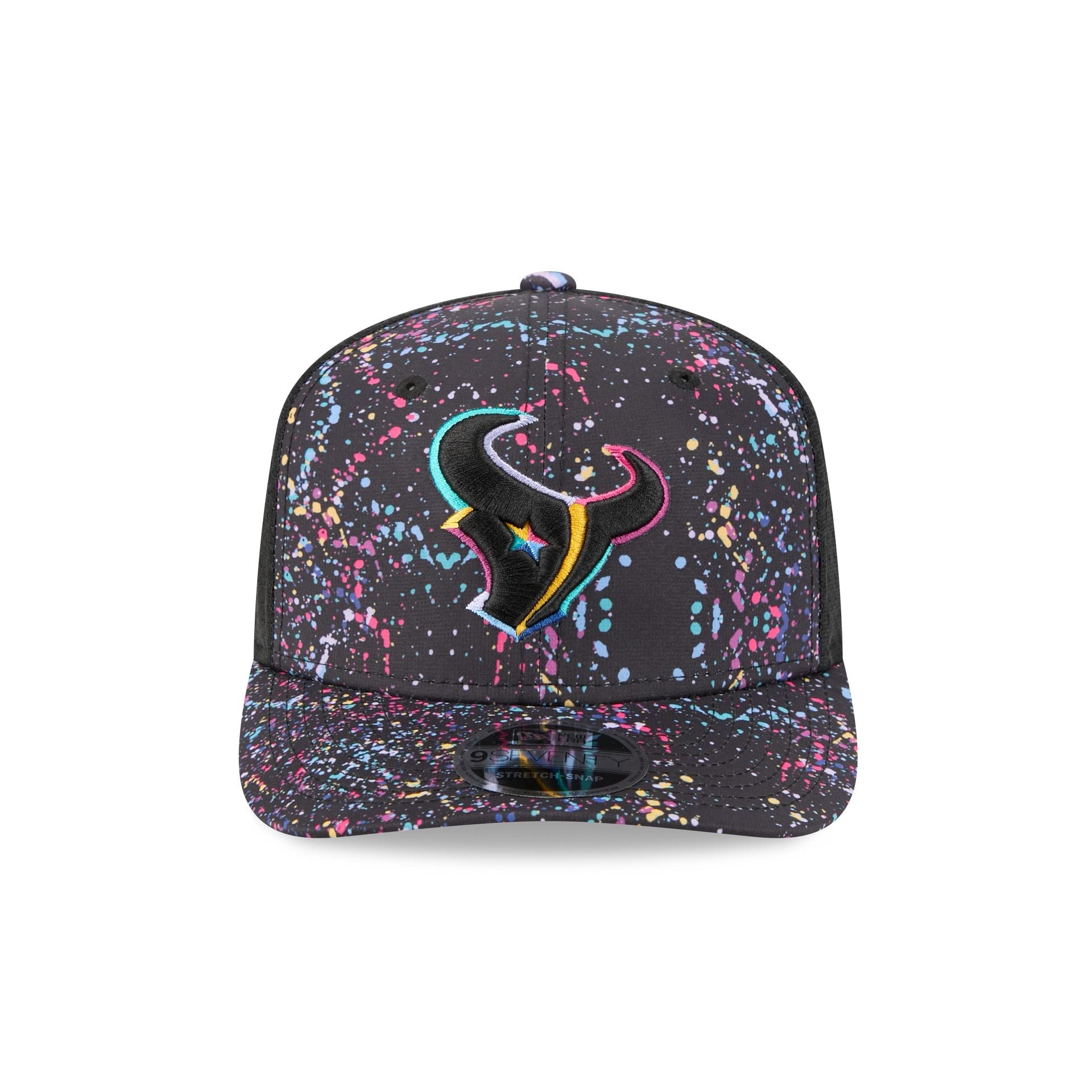 The Houston Texans 2025 Crucial Catch 9SEVENTY Trucker features an embroidered Texans logo at the front paint splatter panels with a woven NFL Shield tag above a snapback closure at the rear. Additional details include a Crucial Catch Intercept Cancer patch at the right-wear side with performance mesh rear panels and a black undervisor.
