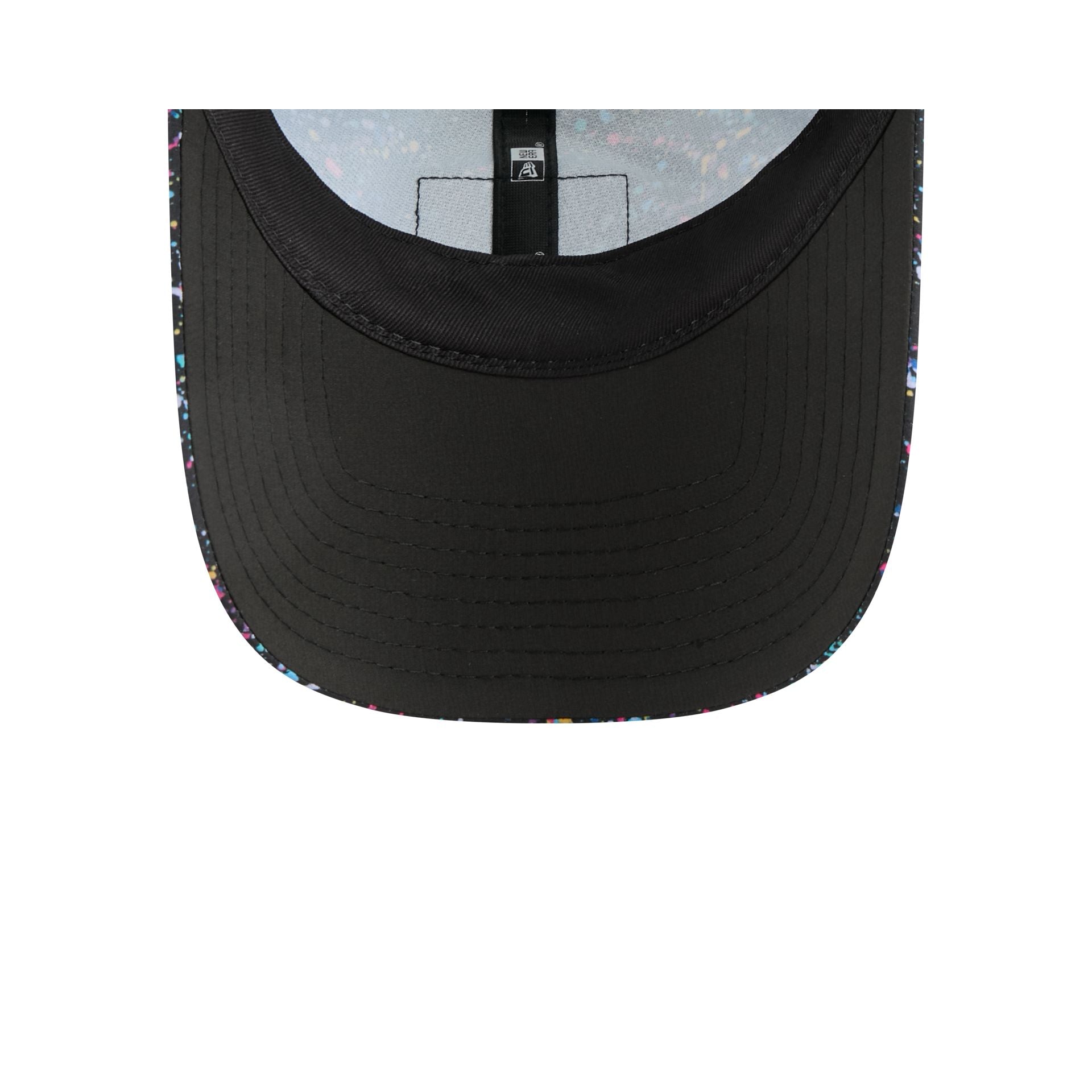 The Kansas City Chiefs 2025 Crucial Catch Women's Open Back Adjustable Cap features a woven Chiefs logo at the front paint splatter panels with a woven NFL Shield tag at the adjustable strapback closure at the rear. Additional details include a Crucial Catch Intercept Cancer patch at the right-wear side with a black undervisor.