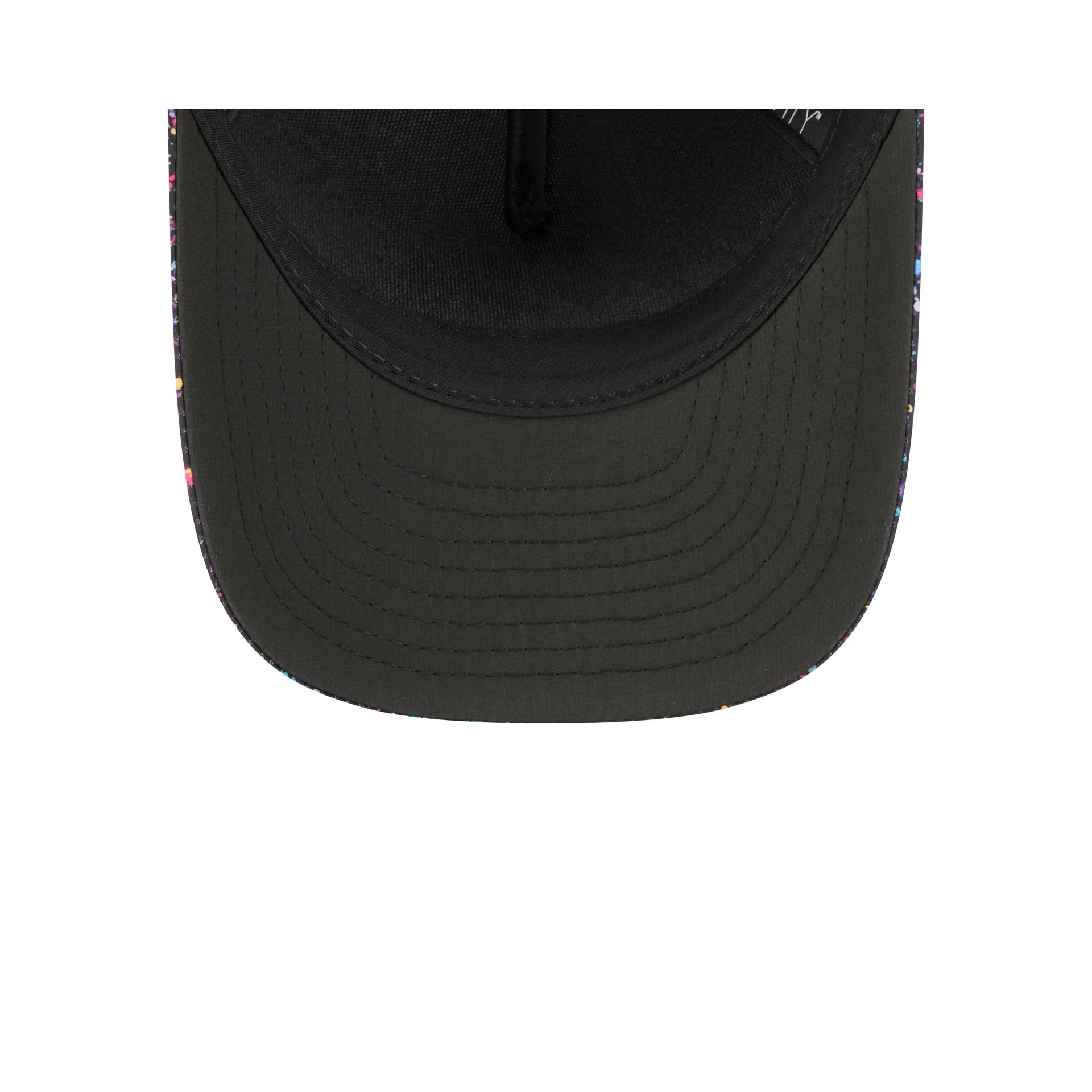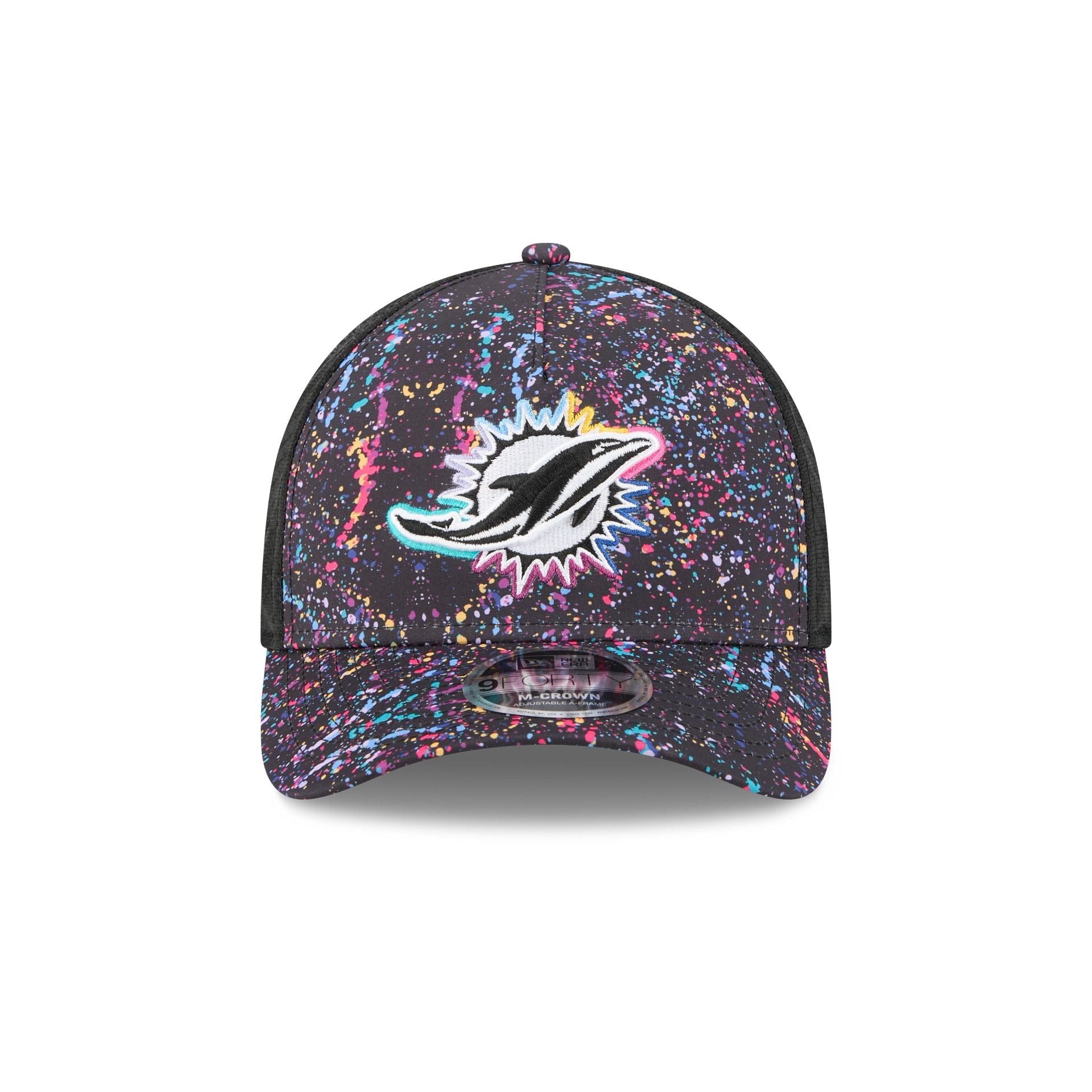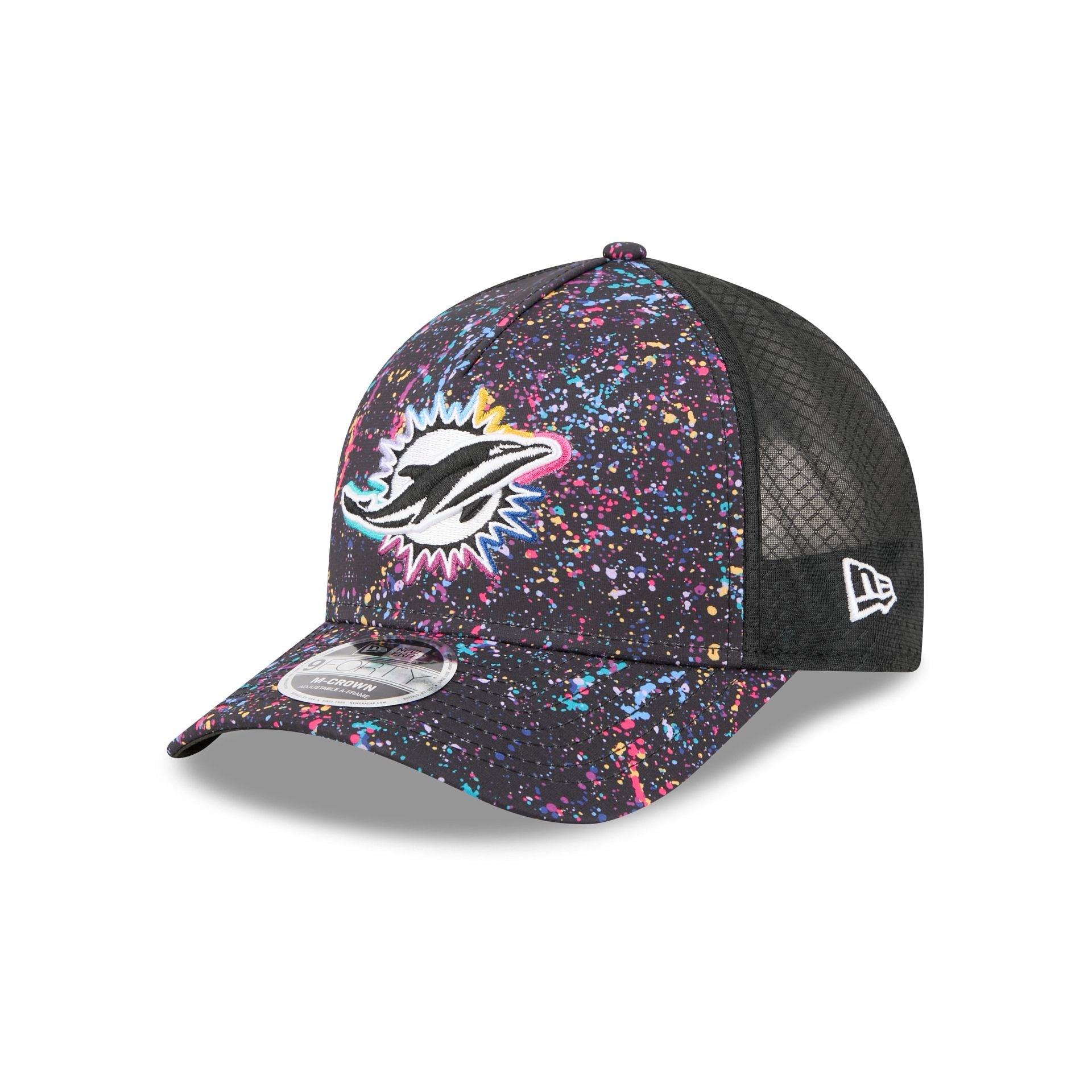 The Miami Dolphins 2025 Crucial Catch 9FORTY M-Crown A-Frame Trucker features an embroidered Dolphins logo at the front paint splatter panels with a woven NFL Shield tag above a snapback closure at the rear. Additional details include a Crucial Catch Intercept Cancer patch at the right-wear side with performance mesh rear panels and a black undervisor.