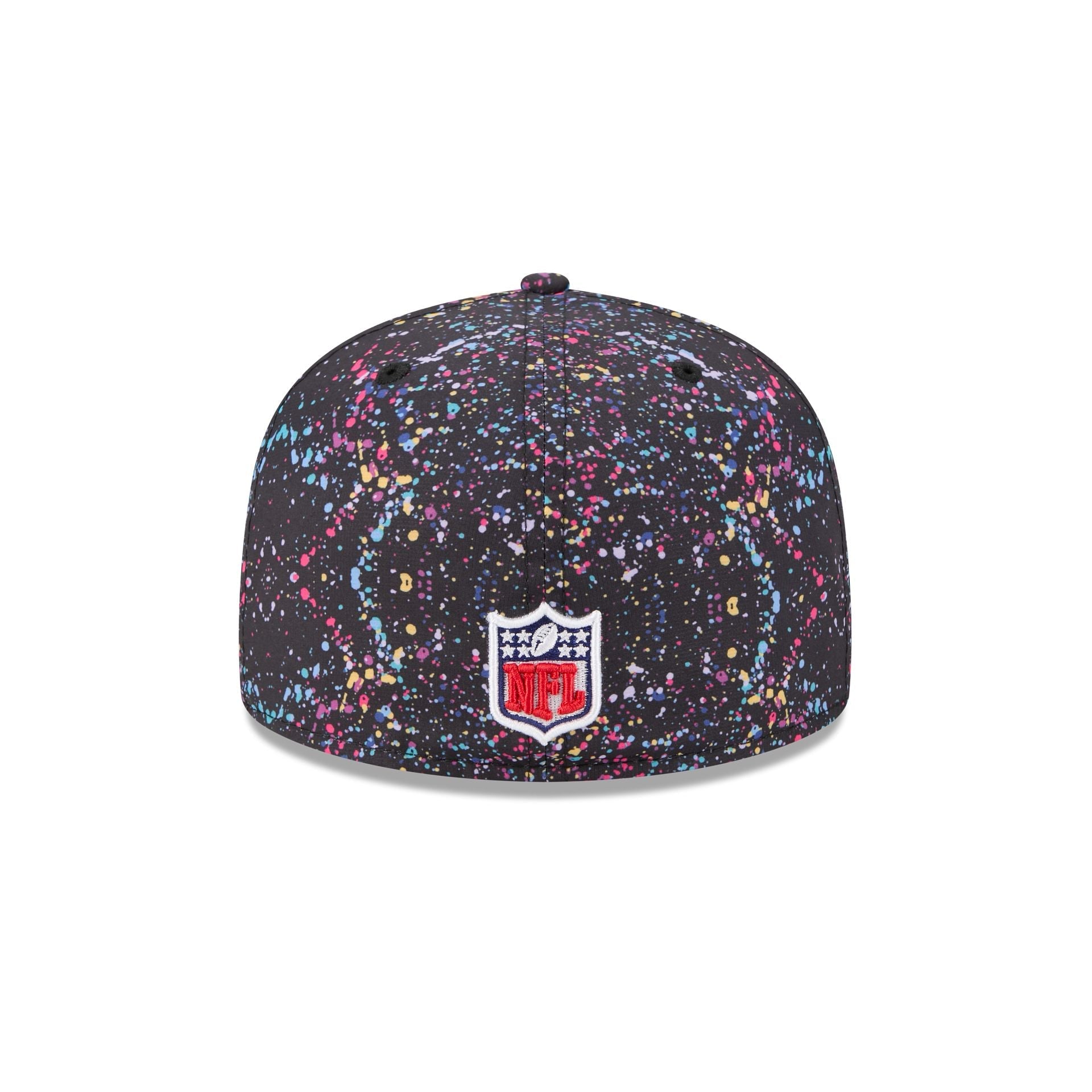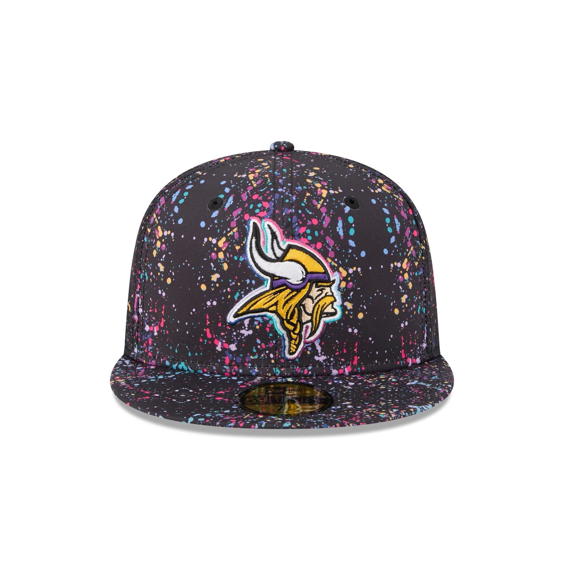 The Minnesota Vikings 2025 Crucial Catch 59FIFTY Fitted Cap features an embroidered Vikings logo at the front paint splatter panels with an NFL Shield at the rear, a Crucial Catch Intercept Cancer patch at the right-wear side, and a black undervisor.