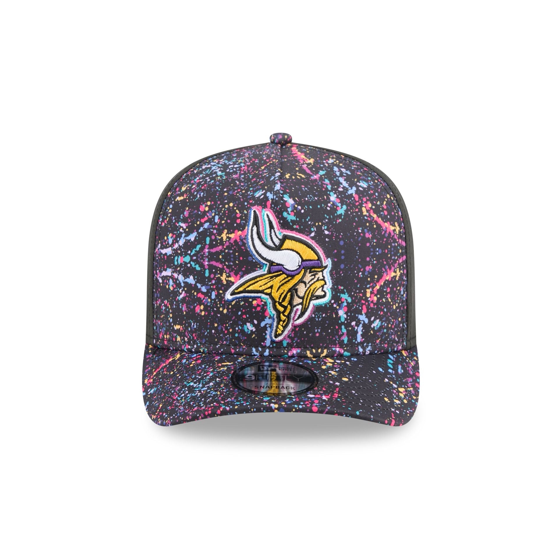 The Minnesota Vikings 2025 Crucial Catch 9FIFTY A-Frame Snapback features an embroidered Vikings logo at the front paint splatter panels with a woven NFL Shield tag above a snapback closure at the rear. Additional details include a Crucial Catch Intercept Cancer patch at the right-wear side and a black undervisor.