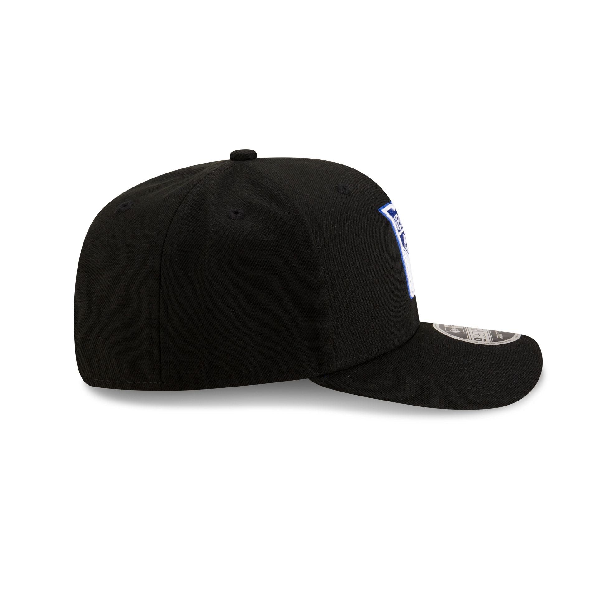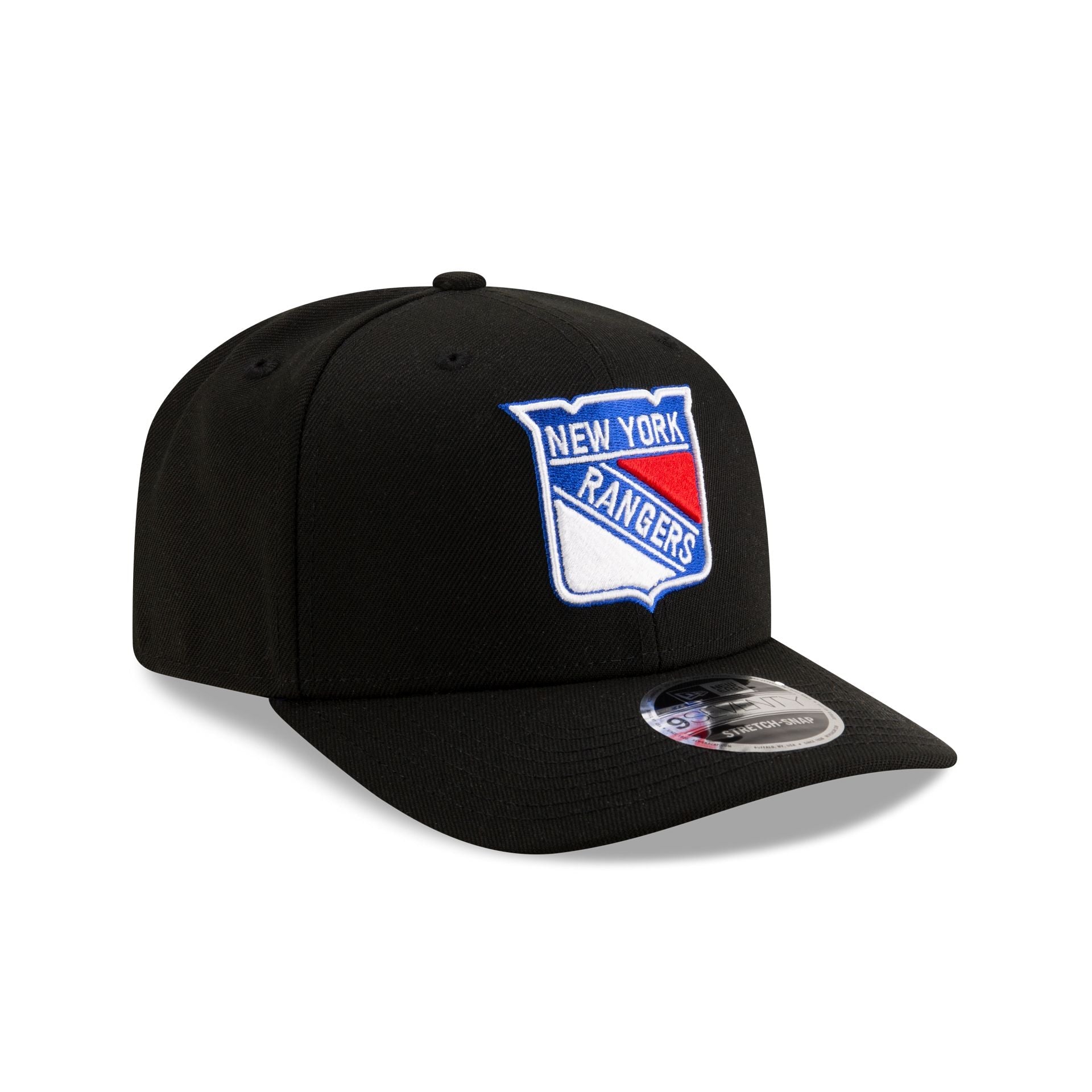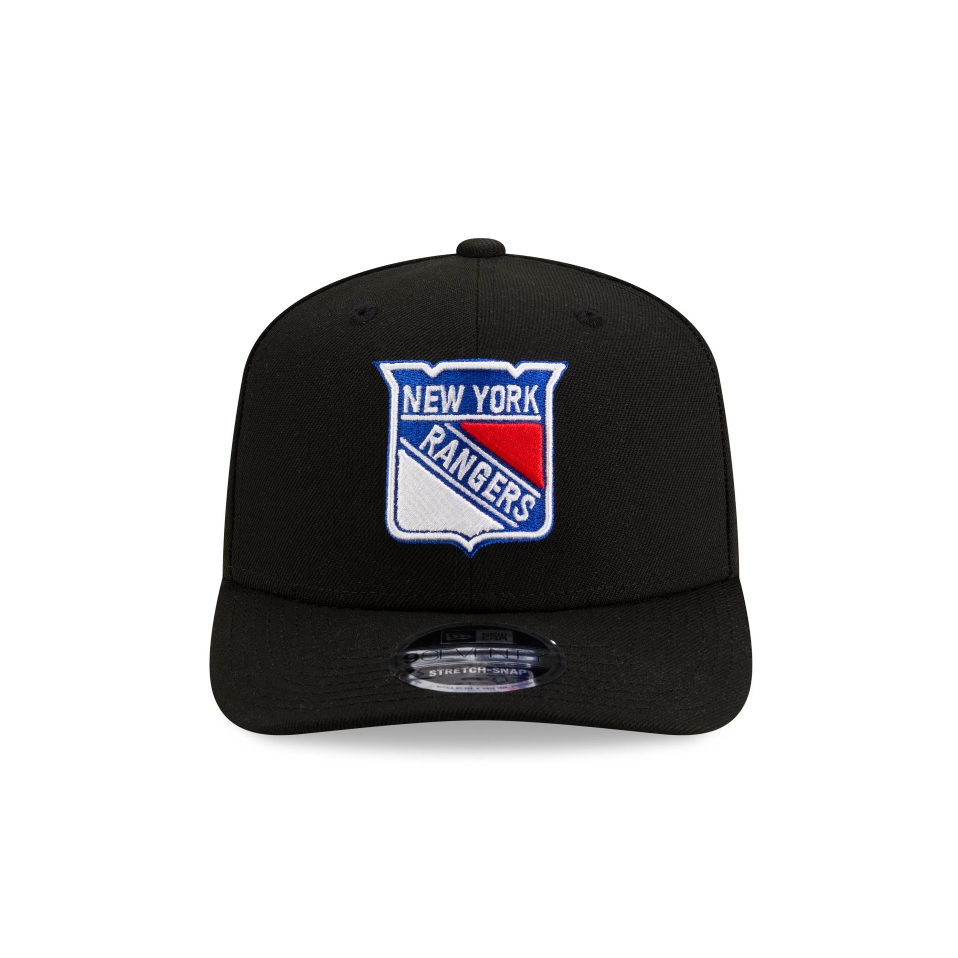 The New York Rangers Black 9SEVENTY Stretch-Snap Cap features an embroidered Rangers logo at the front panels with a matching NHL Shield above a snanpback closure at the rear and a black undervisor.