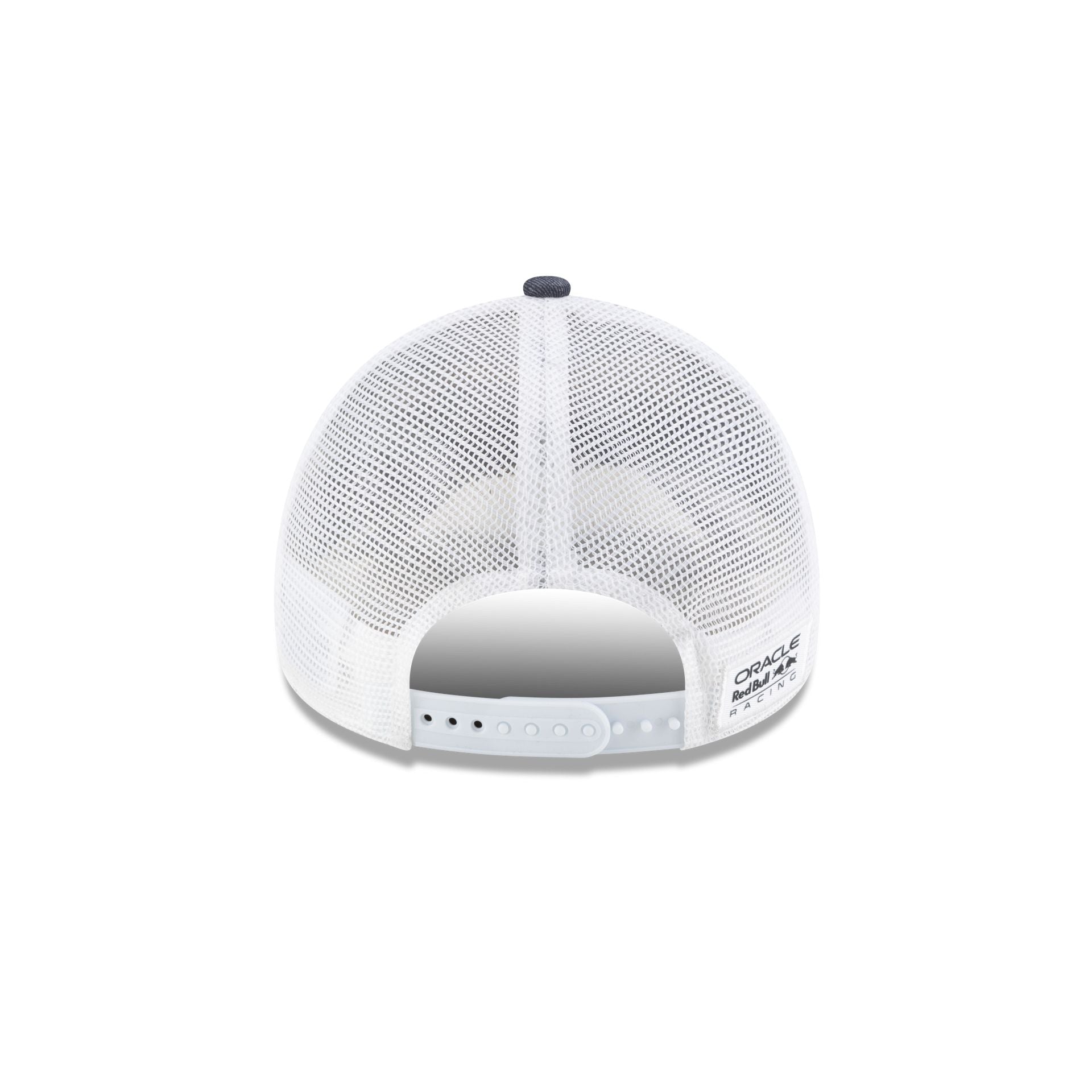 The Oracle Red Bull Racing Night Sky Navy 9FORTY A-Frame Trucker features an embroidered Oracle Red Bull Racing logo at the front panels with an adjustable stretch-snap closure at a mesh rear.