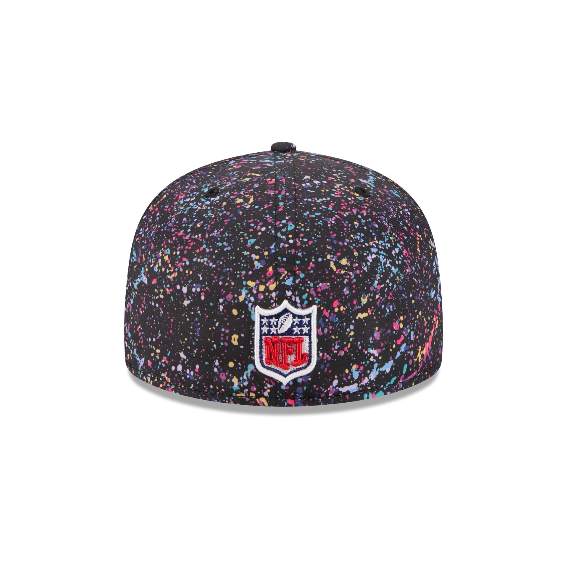 The Philadelphia Eagles 2025 Crucial Catch 59FIFTY Fitted Cap features an embroidered Eagles logo at the front paint splatter panels with an NFL Shield at the rear, a Crucial Catch Intercept Cancer patch at the right-wear side, and a black undervisor.
