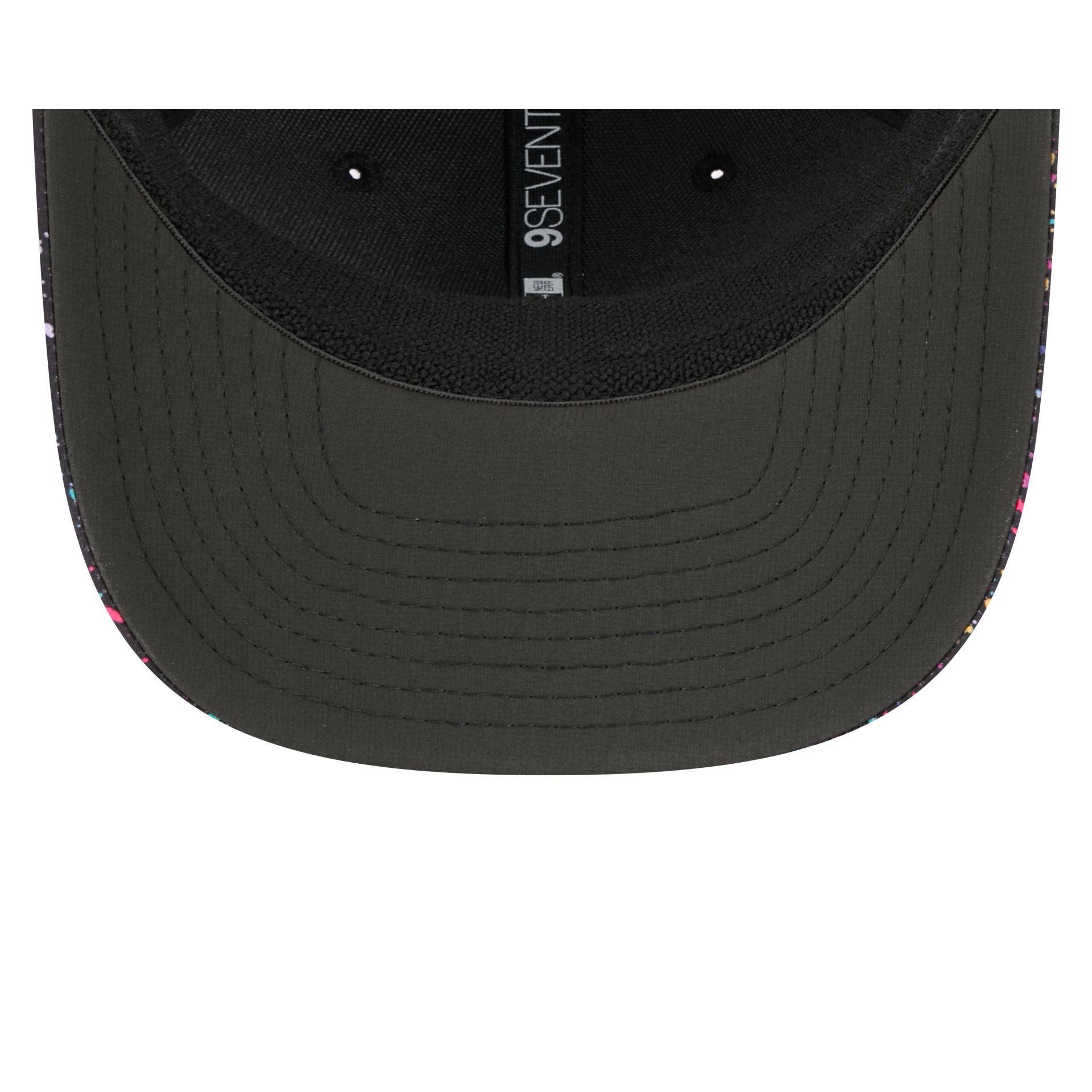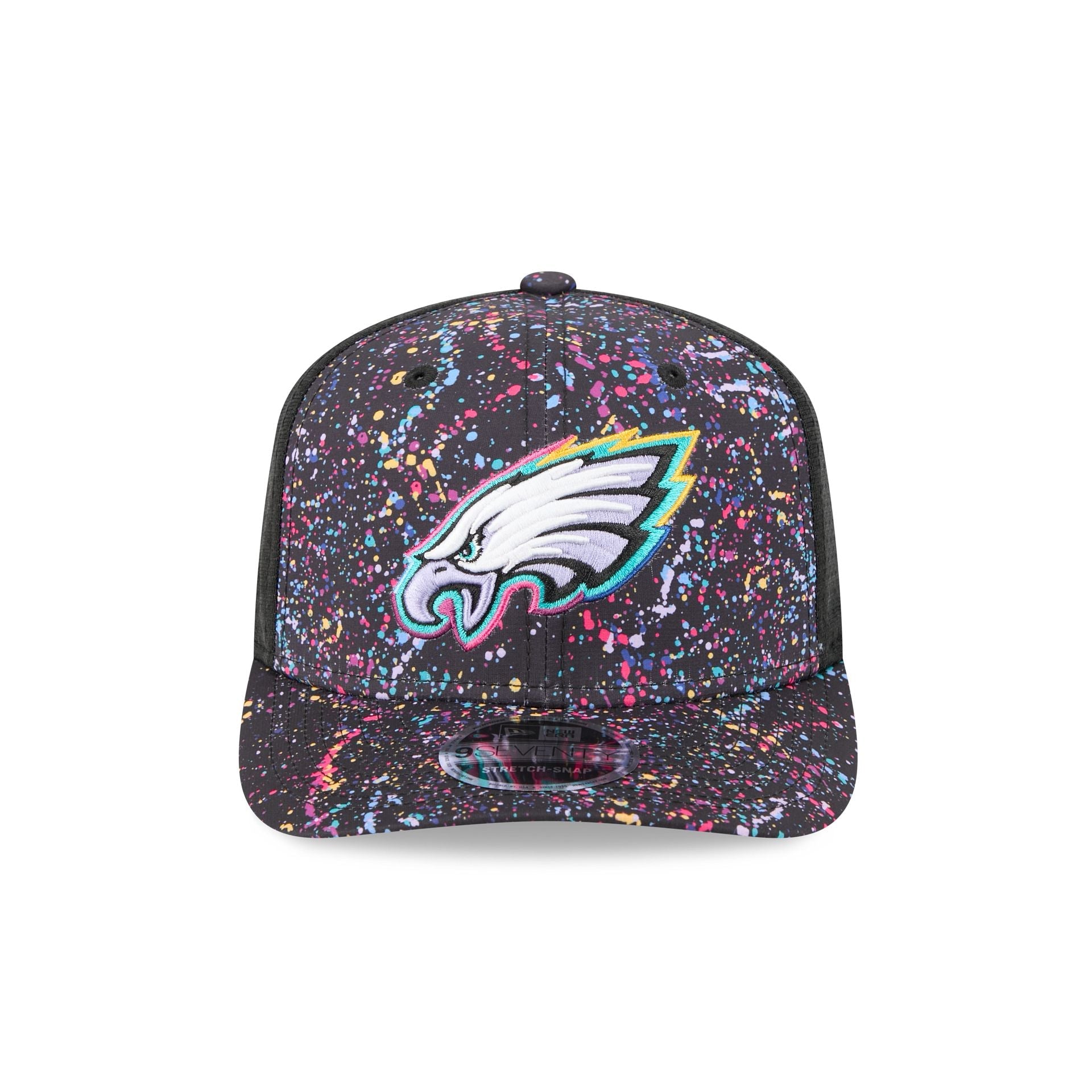 The Philadelphia Eagles 2025 Crucial Catch 9SEVENTY Trucker features an embroidered Eagles logo at the front paint splatter panels with a woven NFL Shield tag above a snapback closure at the rear. Additional details include a Crucial Catch Intercept Cancer patch at the right-wear side with performance mesh rear panels and a black undervisor.