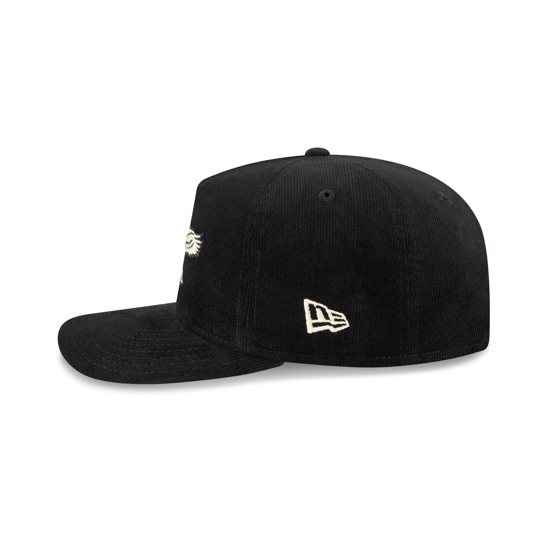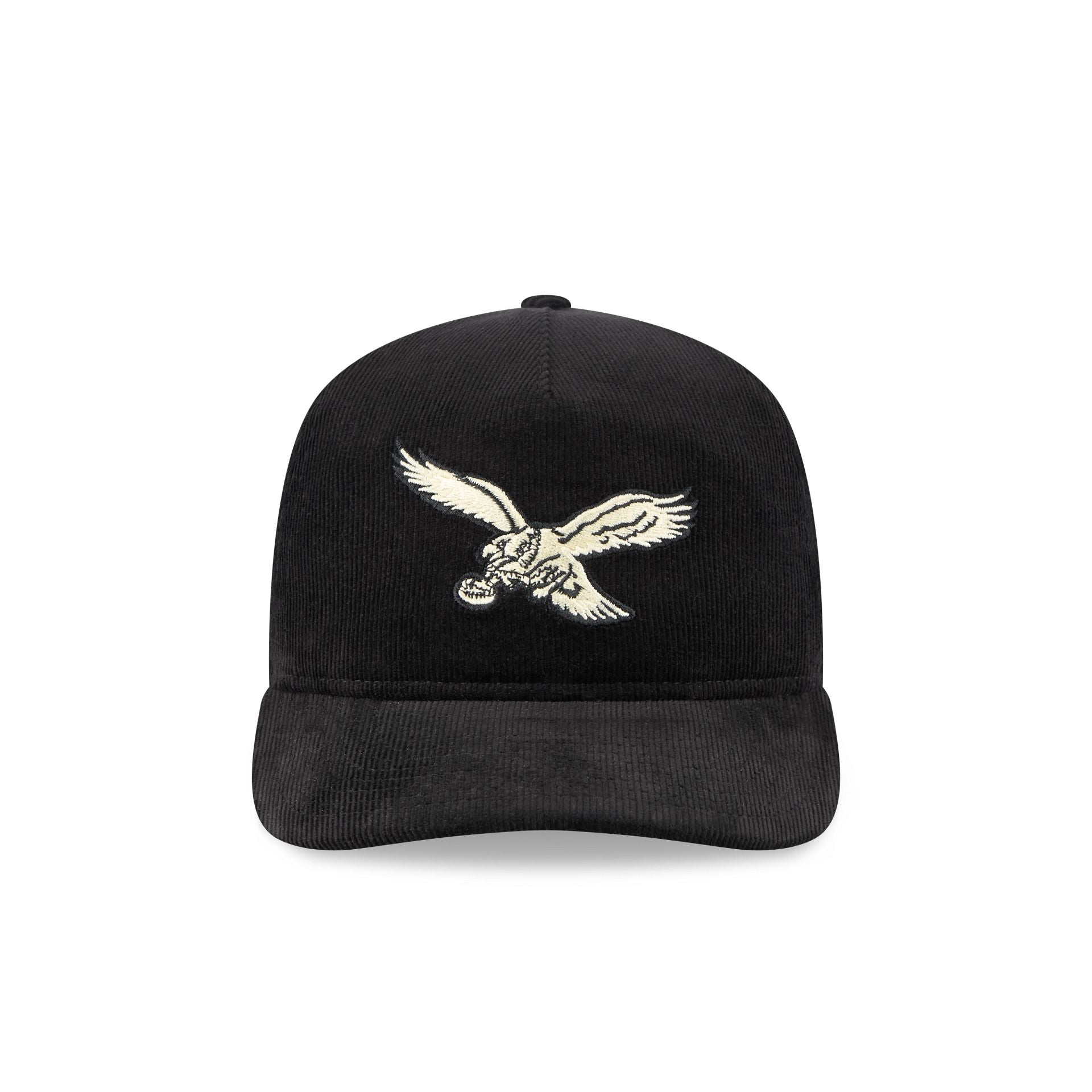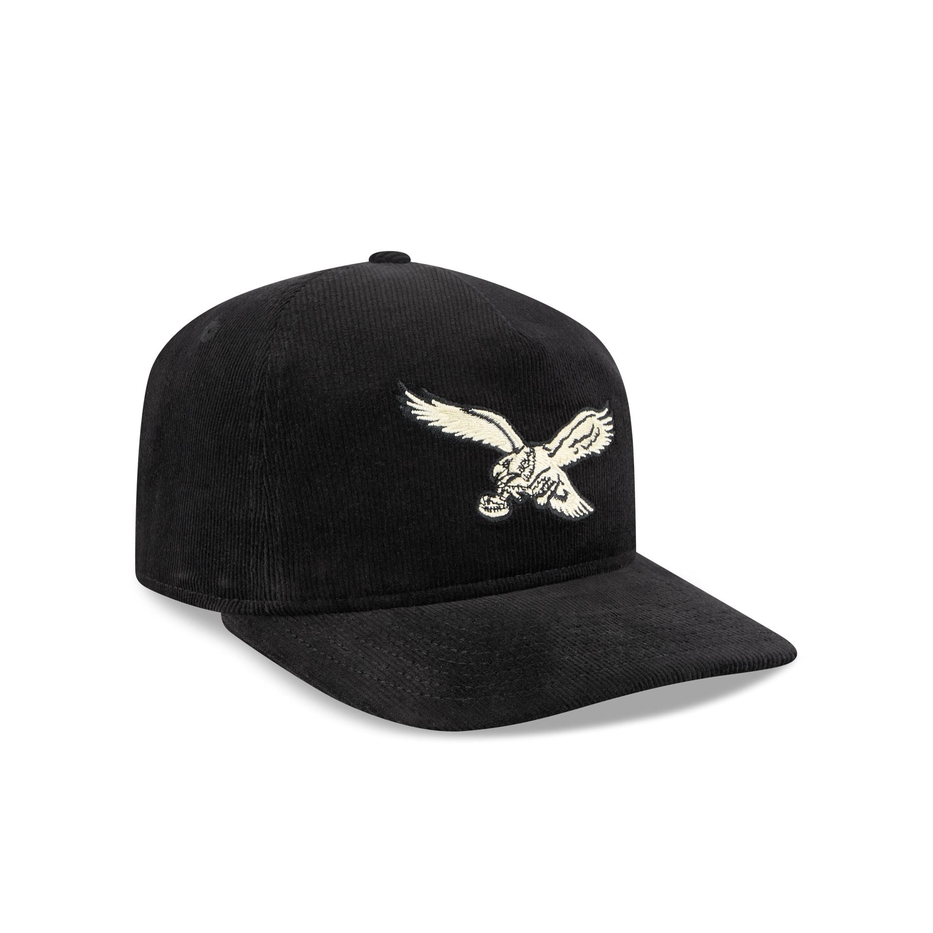 The Philadelphia Eagles Nostalgic Black Corduroy 19TWENTY Adjustable Cap features an embroidered Eagles Historic logo at the front panel with a snapback closure at the rear and a gray undervisor.