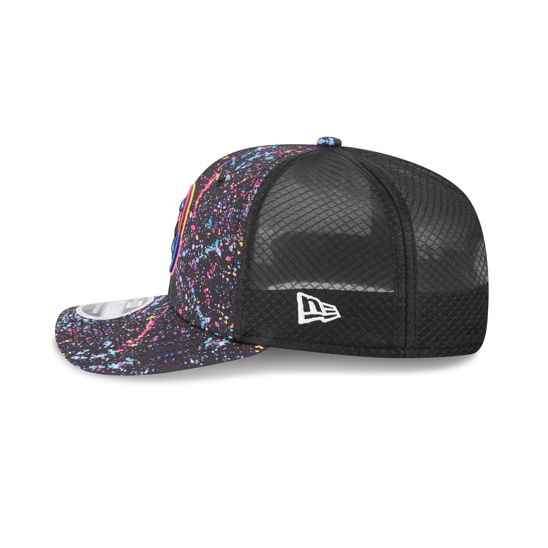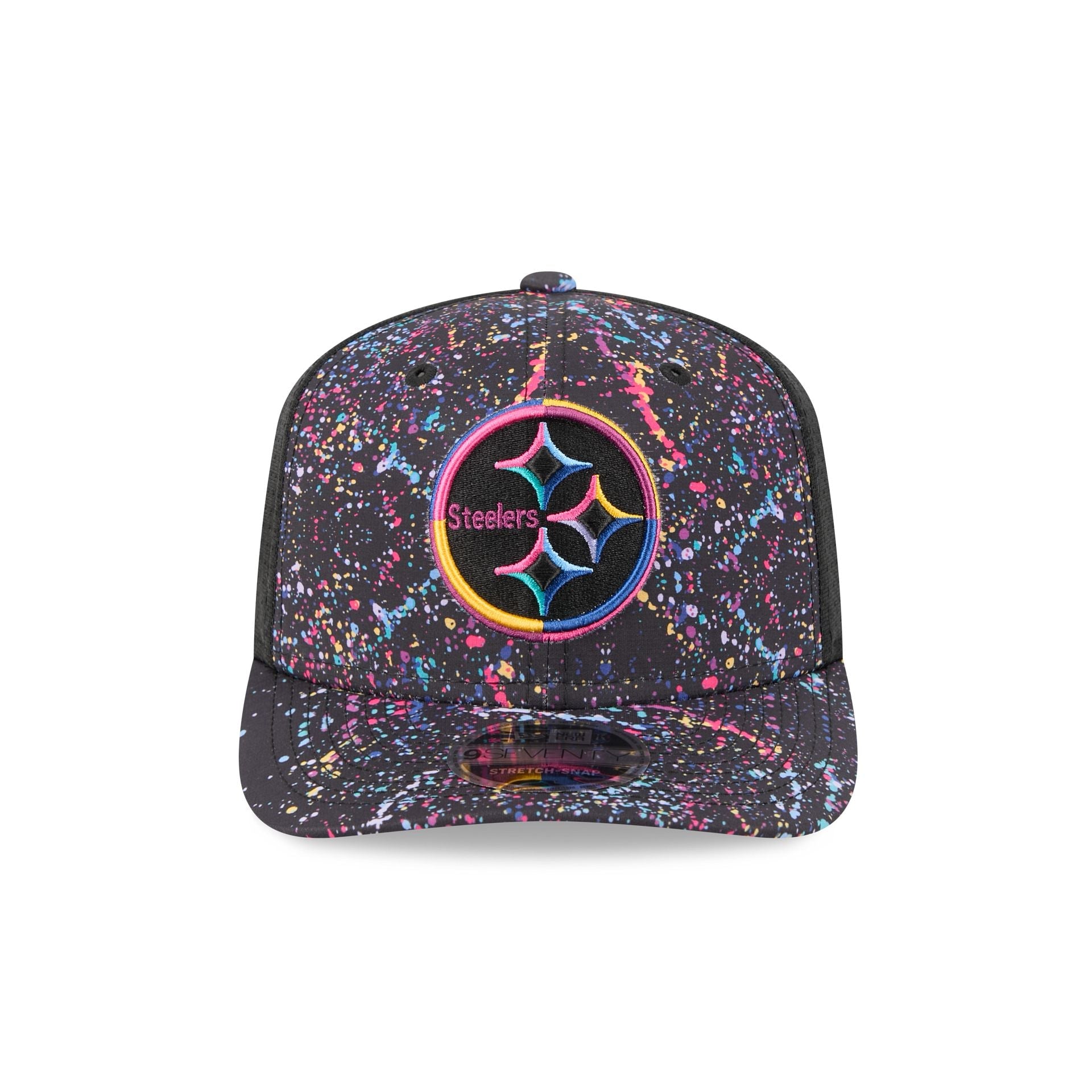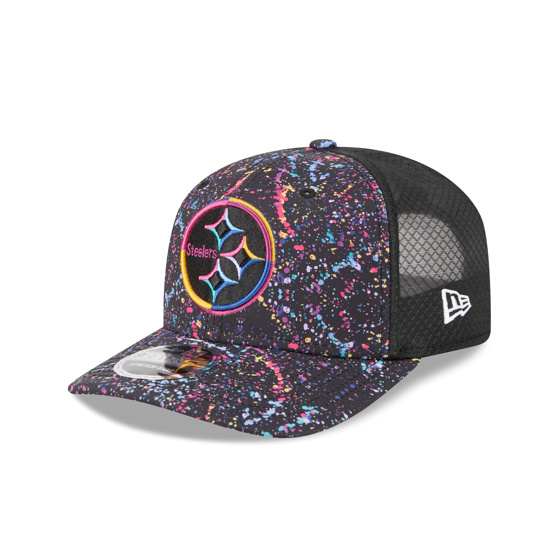 The Pittsburgh Steelers 2025 Crucial Catch 9SEVENTY Trucker features an embroidered Steelers logo at the front paint splatter panels with a woven NFL Shield tag above a snapback closure at the rear. Additional details include a Crucial Catch Intercept Cancer patch at the right-wear side with performance mesh rear panels and a black undervisor.