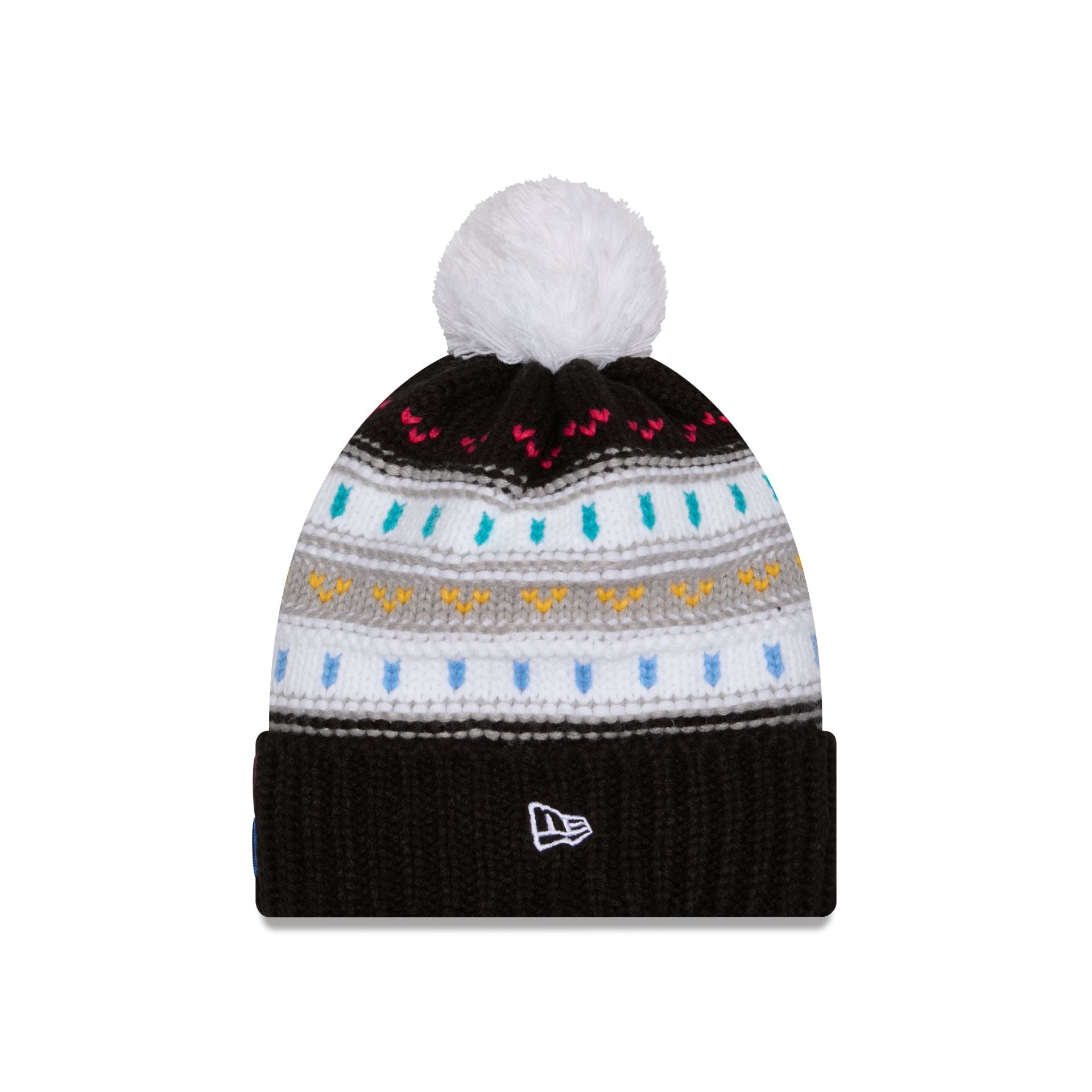 The Pittsburgh Steelers 2025 Crucial Catch Women's Pom Knit features an embroidered Steelers logo at the front with an NFL Shield at the rear, a Crucial Catch Intercept Cancer patch at the right-wear side, and a one-time removeable pom.
