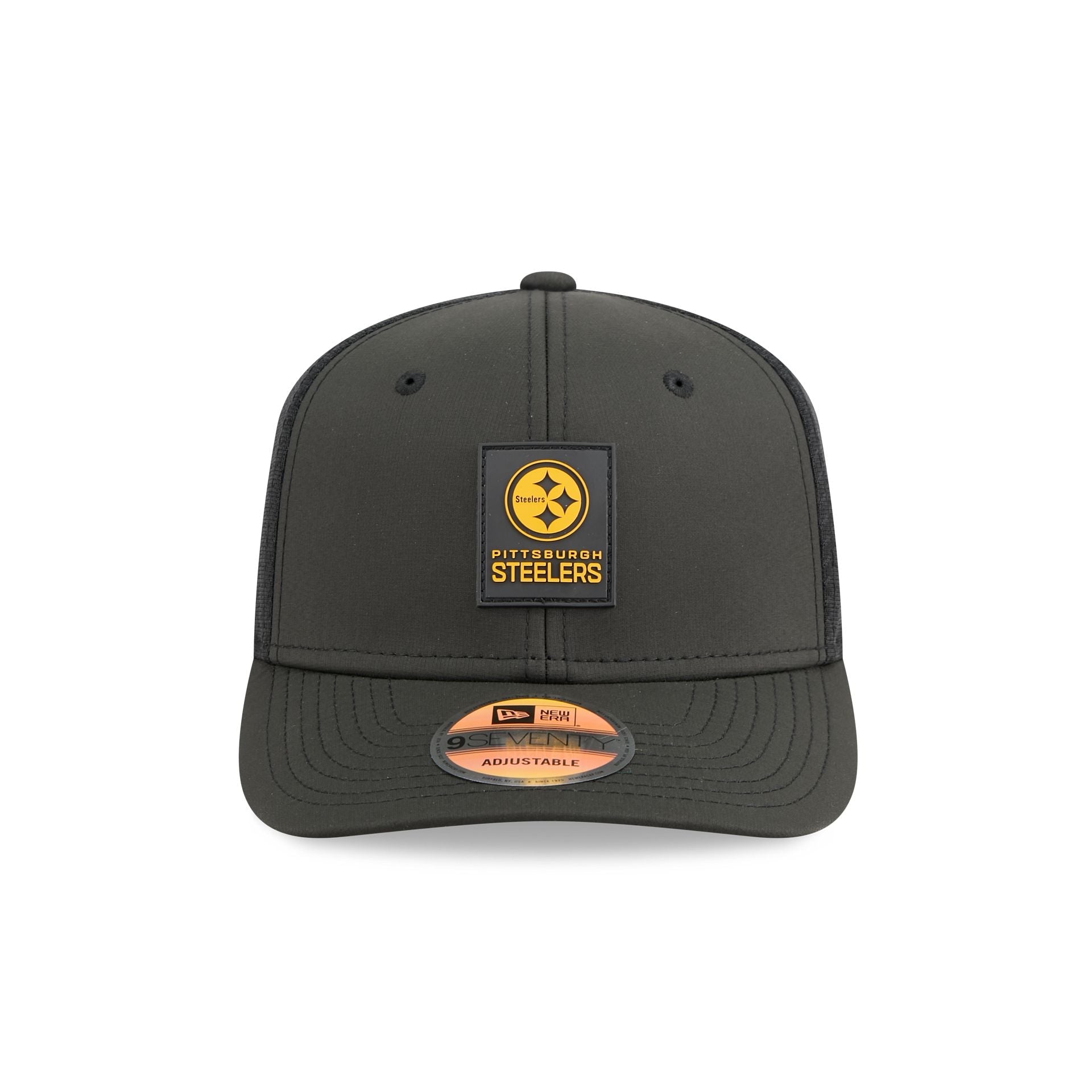 The Pittsburgh Steelers 2025 Sideline Hot Weather 9SEVENTY Trucker features a sewn-down silicone Steelers logo patch at the front panels with a water-repellent quill tech fabrication throughout and a quick-dry cushioned sweatband to absorb moisture. Additional details include the Official NFL Shield logo to the right of a soft silicone snapback closure at a light-weight mesh rear. The undervisor is accented with a silicone transfer in the team’s colors.