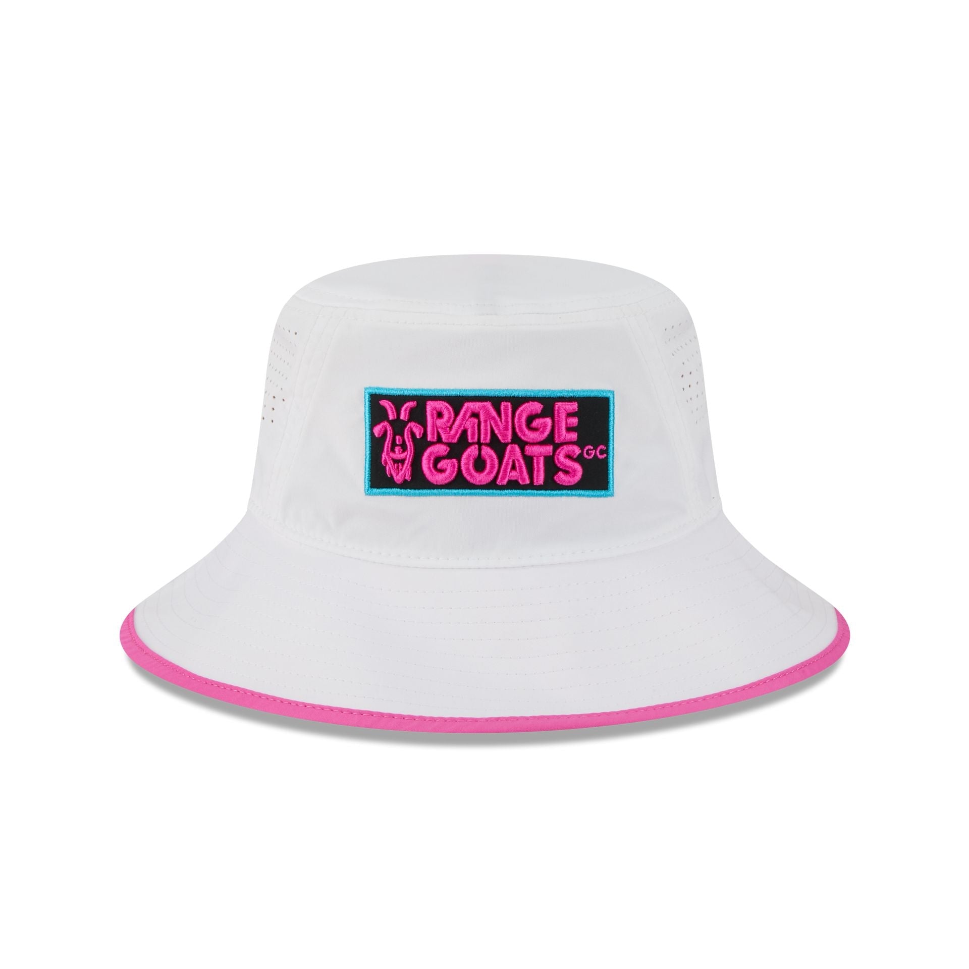 The RangeGoats GC White Explorer Bucket Hat features an embroidered RangeGoats GC logo at the front with an adjustable drawstring and performance mesh at the sides.