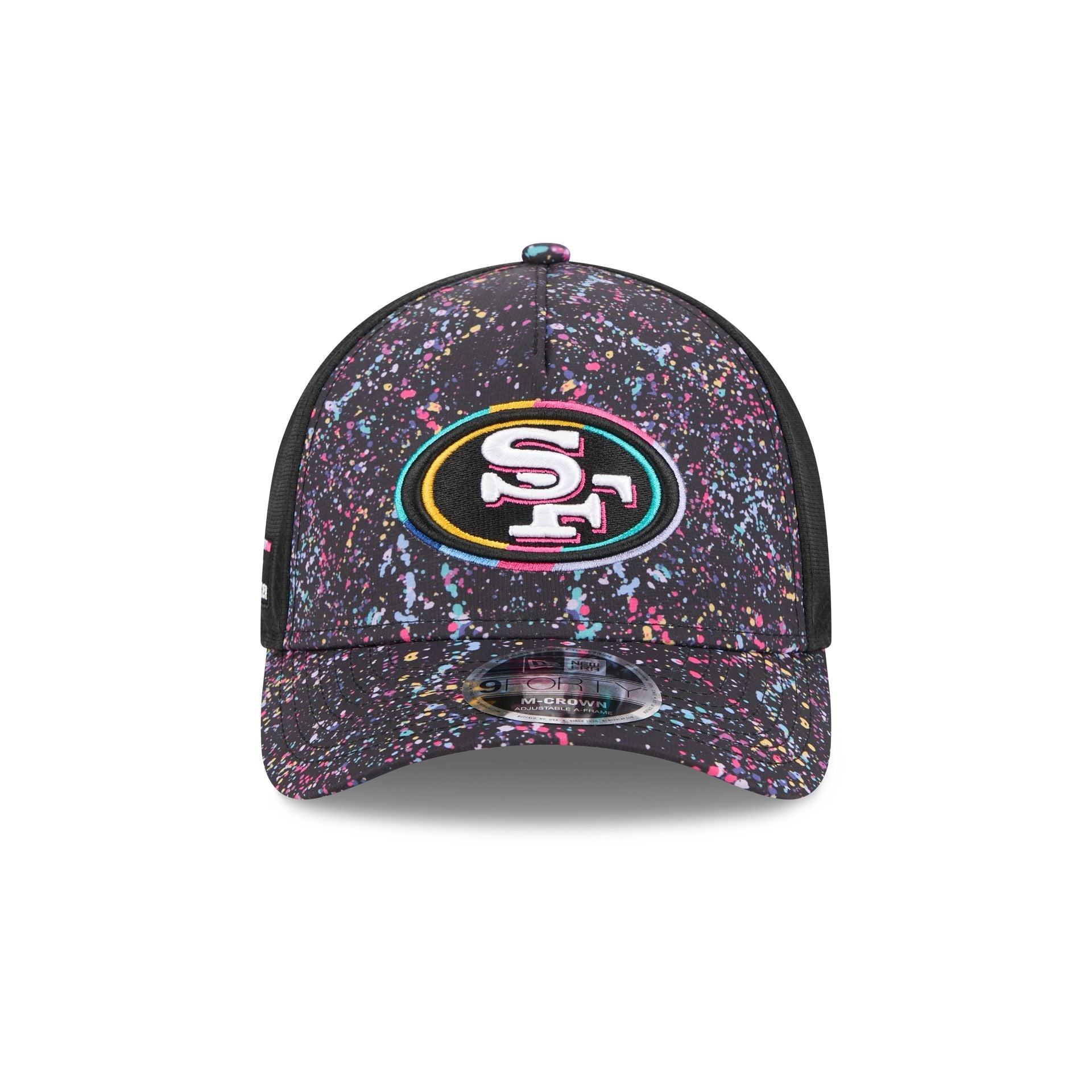 The San Francisco 49ers 2025 Crucial Catch 9FORTY M-Crown A-Frame Trucker features an embroidered 49ers logo at the front paint splatter panels with a woven NFL Shield tag above a snapback closure at the rear. Additional details include a Crucial Catch Intercept Cancer patch at the right-wear side with performance mesh rear panels and a black undervisor.