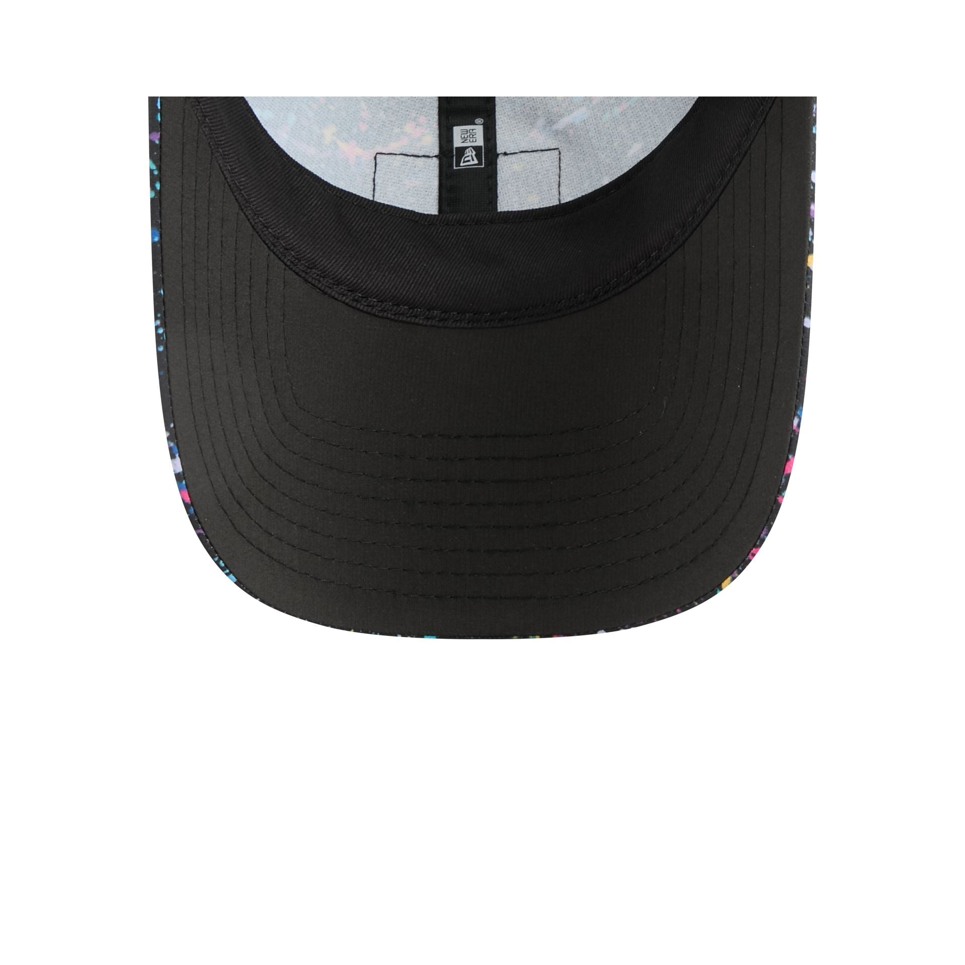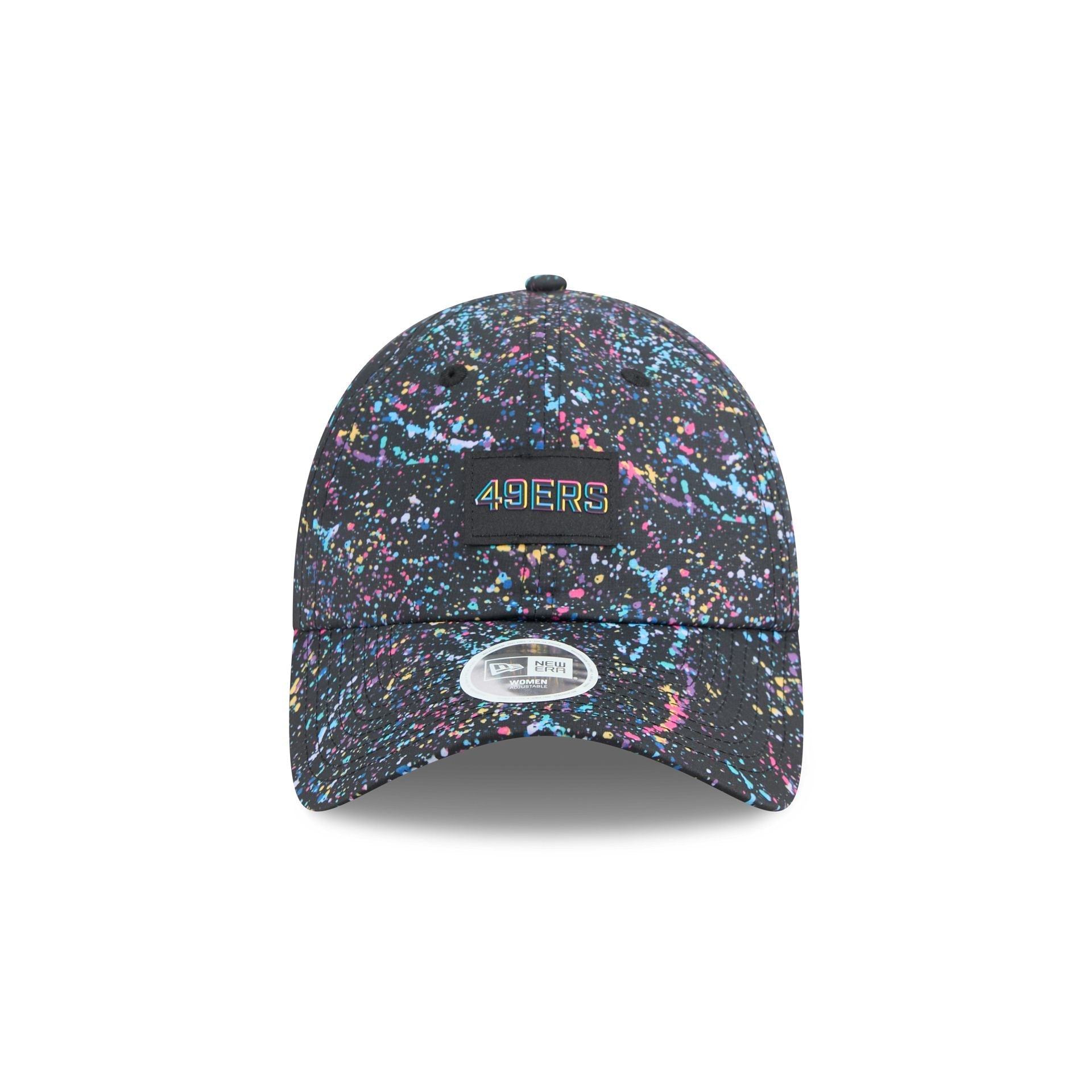 The San Francisco 49ers 2025 Crucial Catch Women's Open Back Adjustable Cap features a woven 49ers logo at the front paint splatter panels with a woven NFL Shield tag at the adjustable strapback closure at the rear. Additional details include a Crucial Catch Intercept Cancer patch at the right-wear side with a black undervisor.