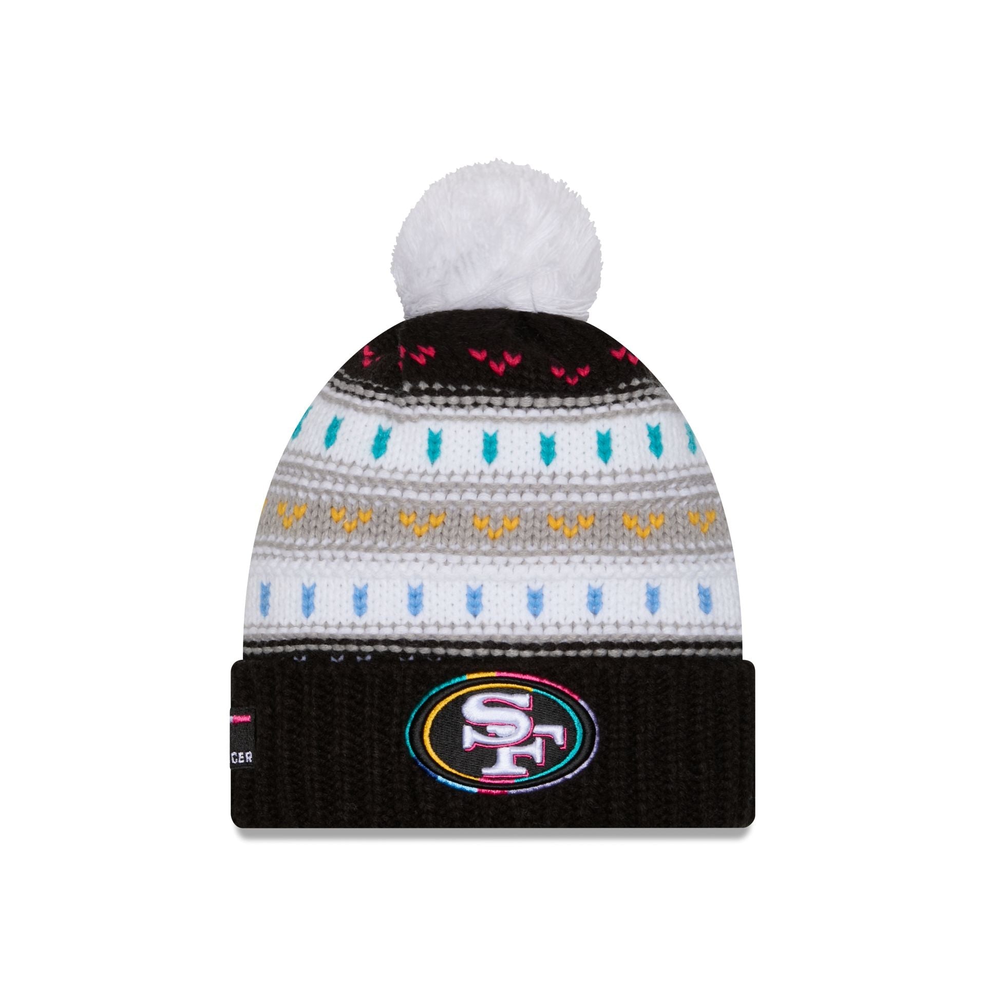 The San Francisco 49ers 2025 Crucial Catch Women's Pom Knit features an embroidered 49ers logo at the front with an NFL Shield at the rear, a Crucial Catch Intercept Cancer patch at the right-wear side, and a one-time removeable pom.