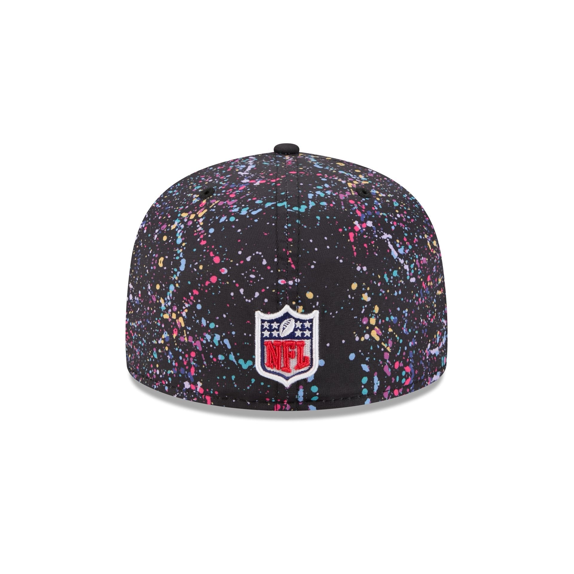 The Tampa Bay Buccaneers 2025 Crucial Catch 59FIFTY Fitted Cap features an embroidered Buccaneers logo at the front paint splatter panels with an NFL Shield at the rear, a Crucial Catch Intercept Cancer patch at the right-wear side, and a black undervisor.