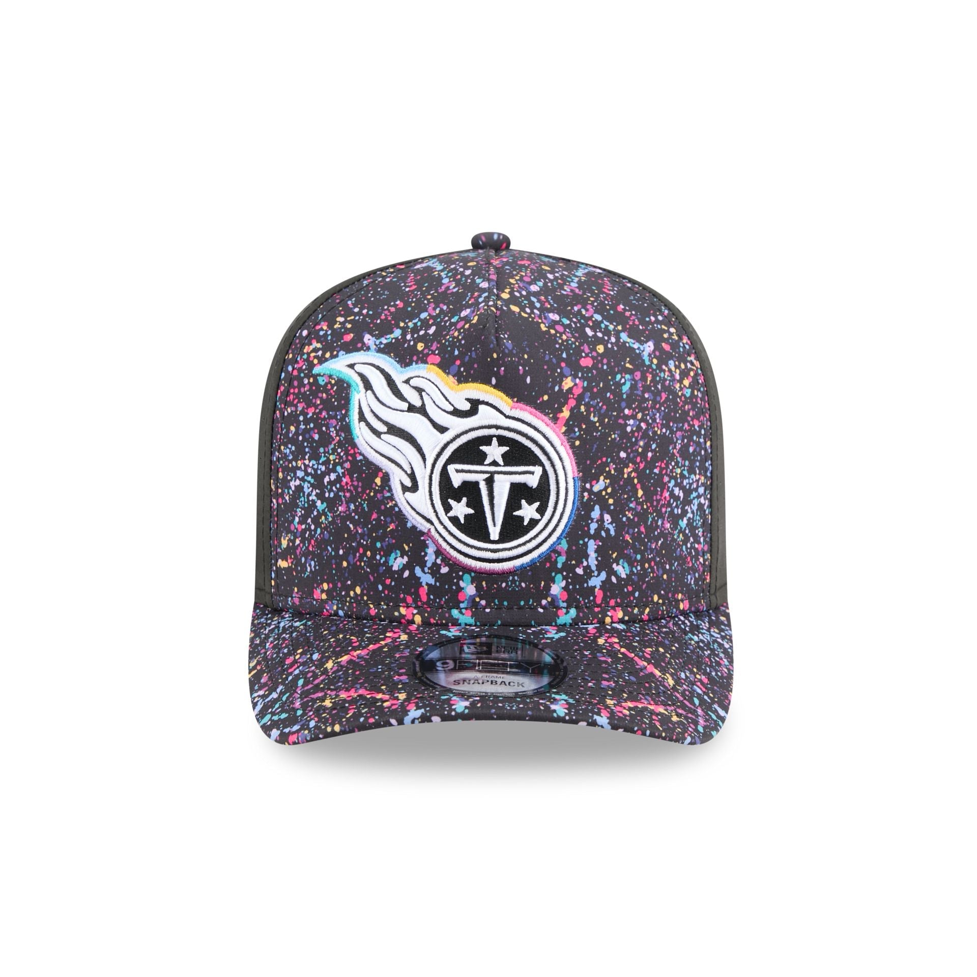 The Tennessee Titans 2025 Crucial Catch 9FIFTY A-Frame Snapback features an embroidered Titans logo at the front paint splatter panels with a woven NFL Shield tag above a snapback closure at the rear. Additional details include a Crucial Catch Intercept Cancer patch at the right-wear side and a black undervisor.