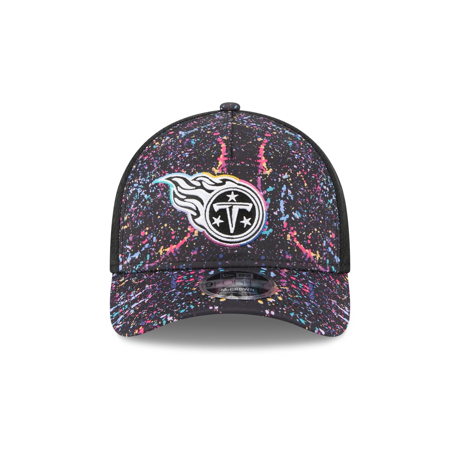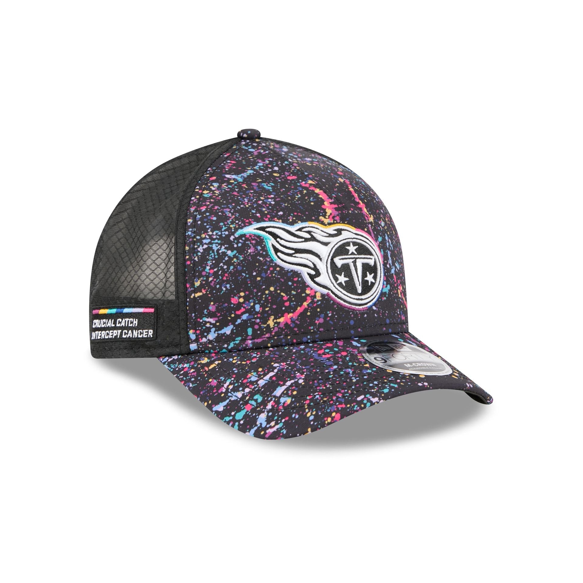 The Tennessee Titans 2025 Crucial Catch 9FORTY M-Crown A-Frame Trucker features an embroidered Titans logo at the front paint splatter panels with a woven NFL Shield tag above a snapback closure at the rear. Additional details include a Crucial Catch Intercept Cancer patch at the right-wear side with performance mesh rear panels and a black undervisor.