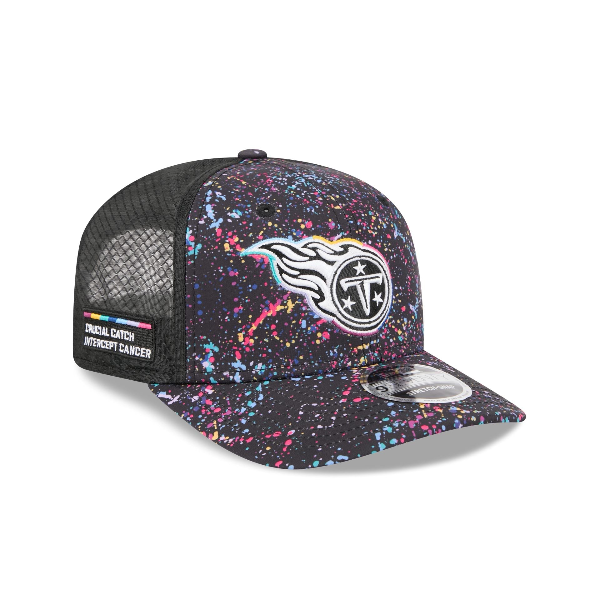 The Tennessee Titans 2025 Crucial Catch 9SEVENTY Trucker features an embroidered Titans logo at the front paint splatter panels with a woven NFL Shield tag above a snapback closure at the rear. Additional details include a Crucial Catch Intercept Cancer patch at the right-wear side with performance mesh rear panels and a black undervisor.