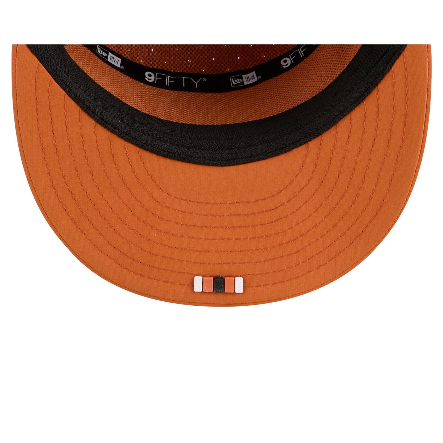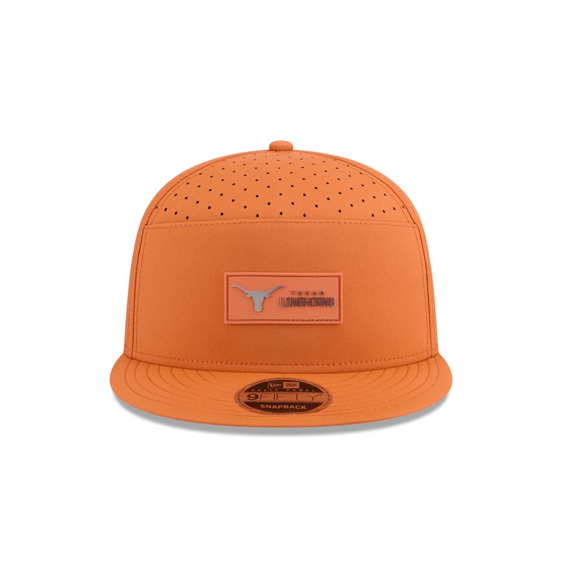 The Texas Longhorns Hot Weather Split Panel 9FIFTY Snapback features a sewn-down silicone Longhorns logo patch at the front panels with a split-crown construction featuring water-repellent quill tech fabrication. Additional details include a team wordmark at a soft silicone snapback closure at the rear with a quick-dry cushioned sweatband to absorb moisture and team color silicone transfer details at the undervisor.