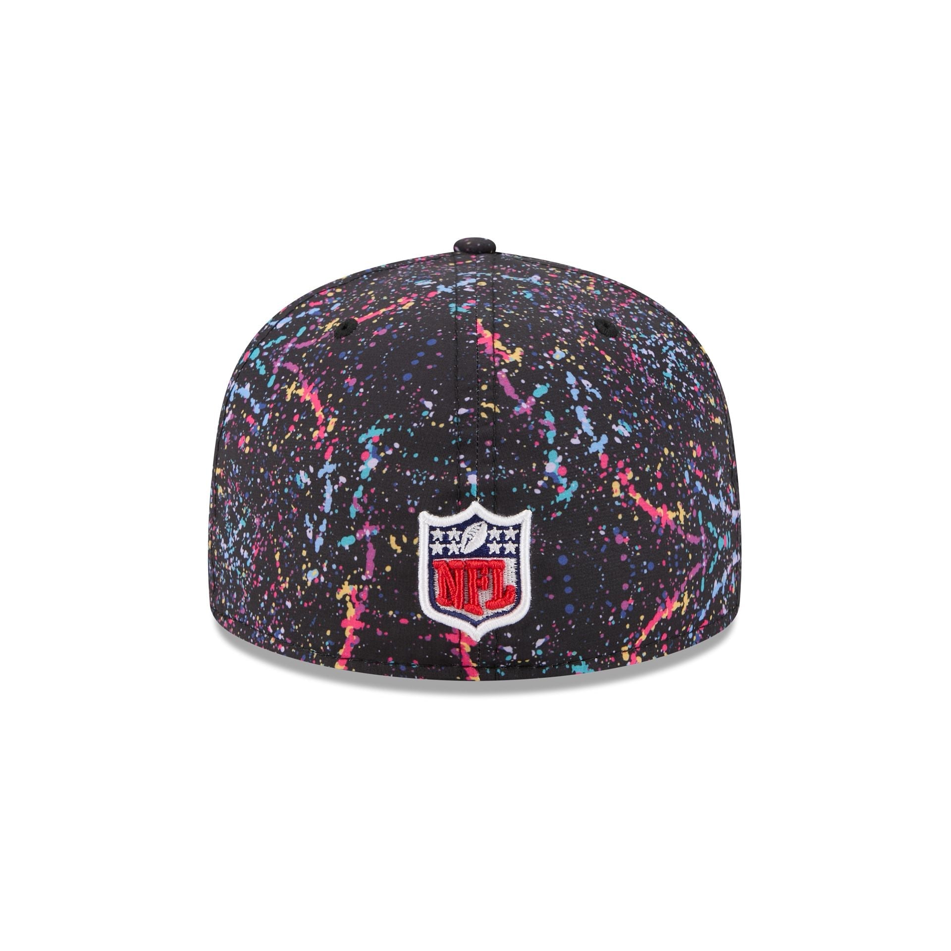 The Washington Commanders 2025 Crucial Catch 59FIFTY Fitted Cap features an embroidered Commanders logo at the front paint splatter panels with an NFL Shield at the rear, a Crucial Catch Intercept Cancer patch at the right-wear side, and a black undervisor.