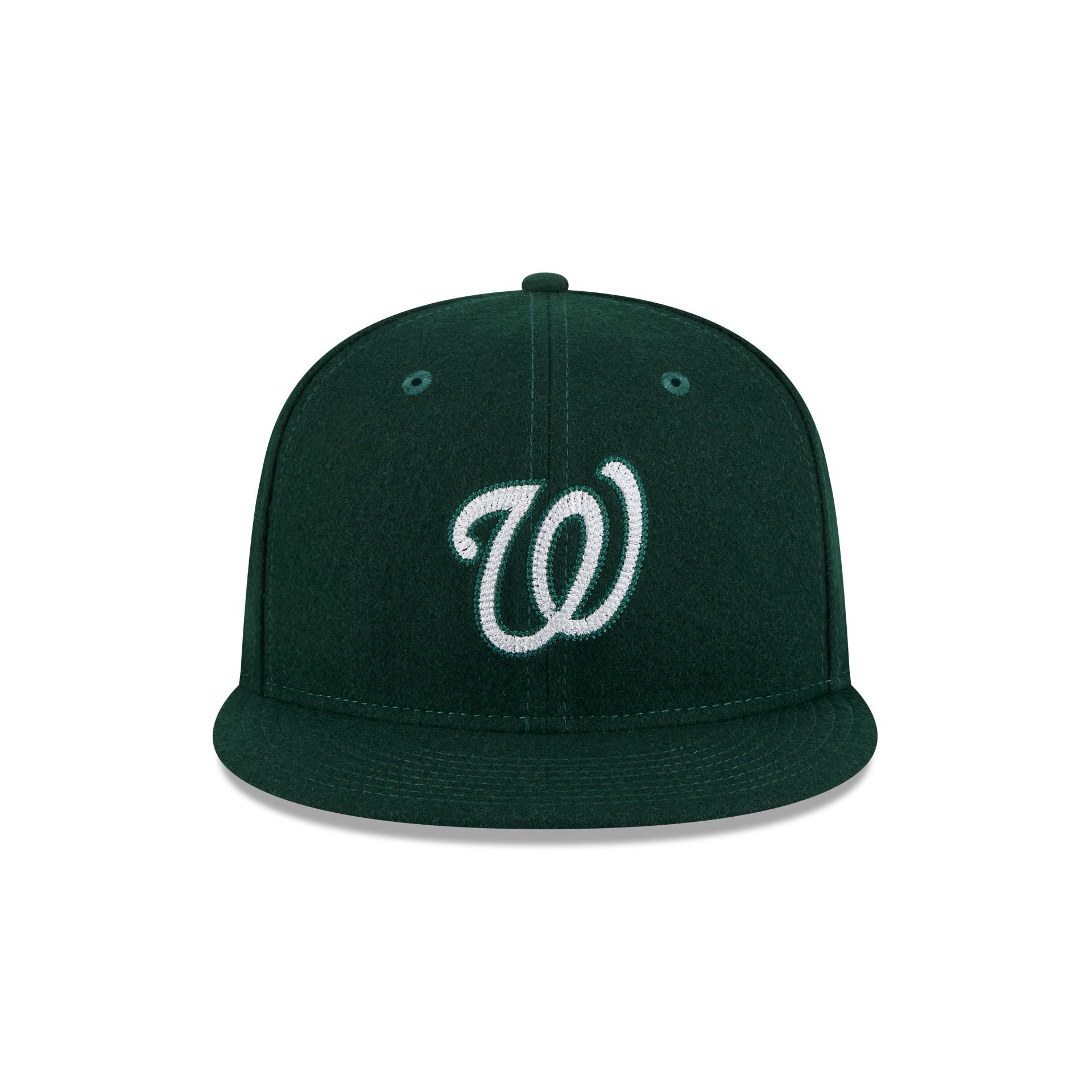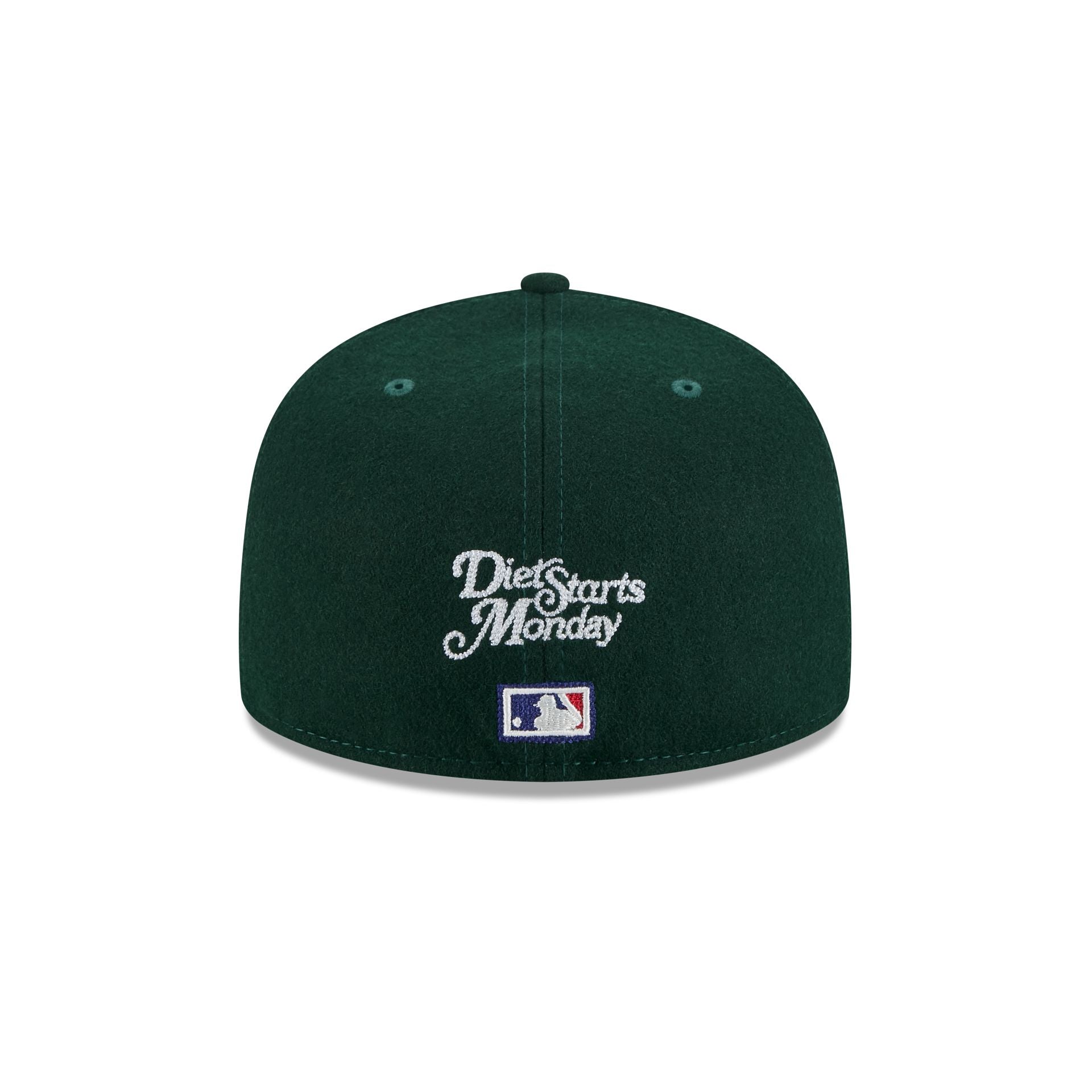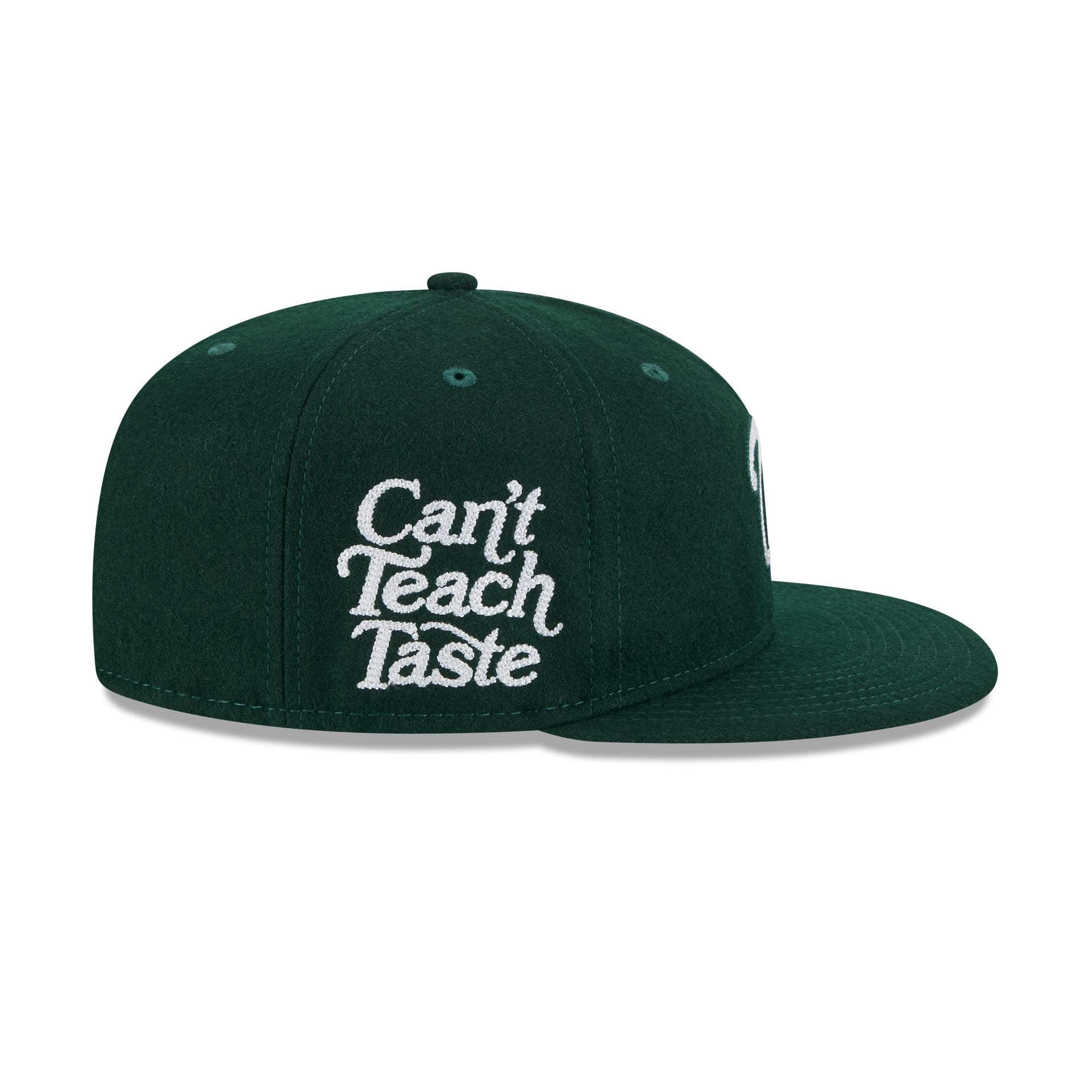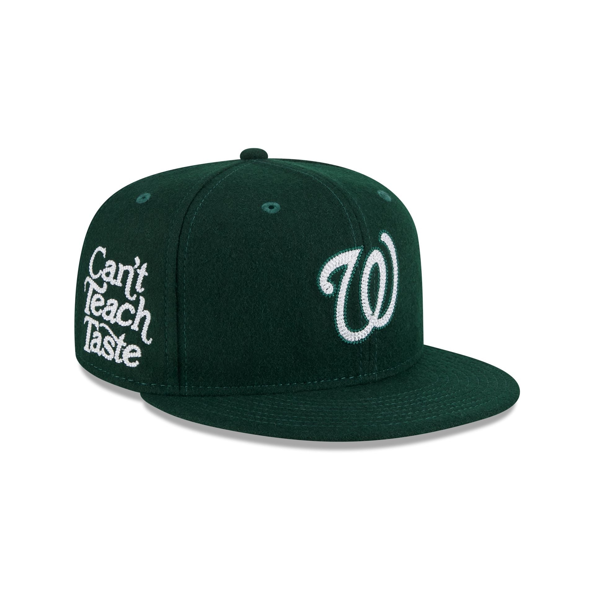 The Washington Nationals Diet Starts Monday Can't Teach Taste Green 59FIFTY Fitted Cap features an embroidered Nationals Cooperstown logo at the front with a matching MLB Batterman logo and Diet Starts Monday logo at the rear. Additional details include a Can't Teach Taste wordmark at the right-wear side and a green undervisor. This cap has a wool fabrication throughout.