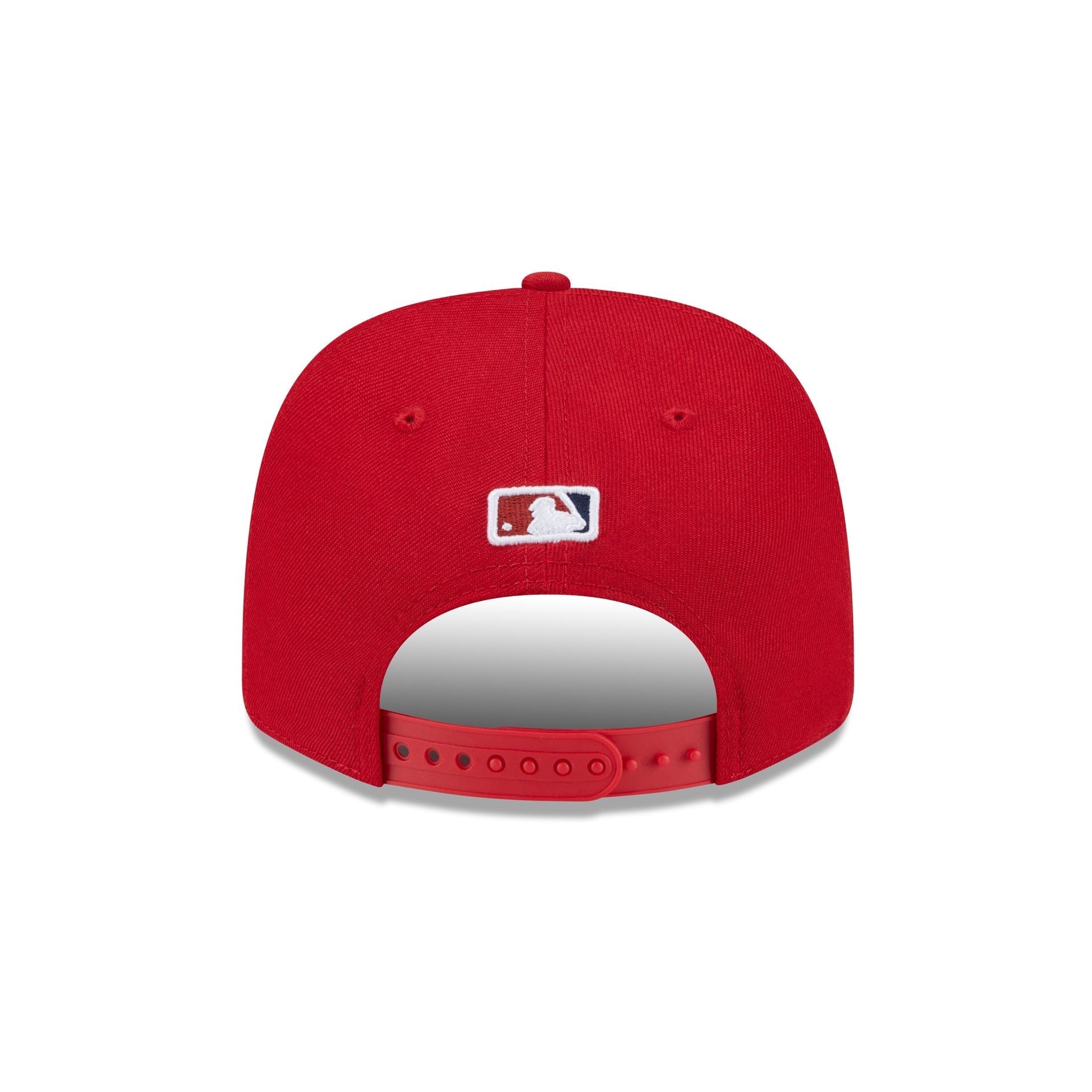 The Washington Nationals Game 9SEVENTY Stretch-Snap features an embroidered Nationals logo at the front panels with a matching MLB Batterman logo above a snapback closure at the rear and a black undervisor.