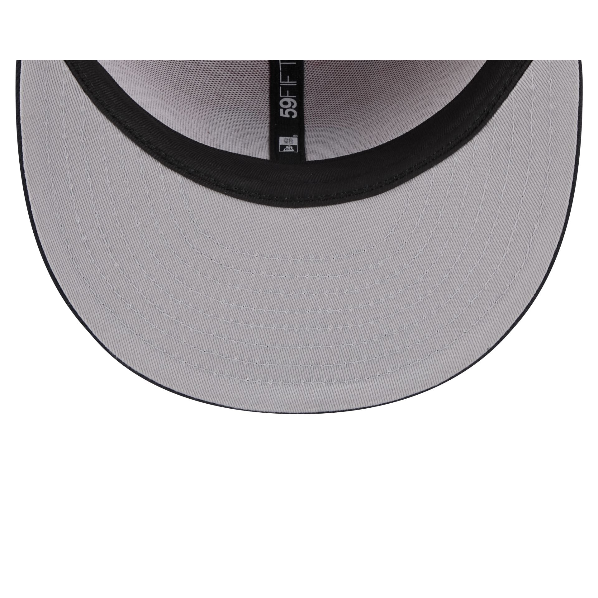 The Washington Nationals Pinstripe League Pin 59FIFTY Fitted Cap features an embroidered Nationals logo at the front panels with a League pin at the front right panel. Additional details include pinstripes, a matching MLB Batterman logo at the rear, and a gray undervisor.