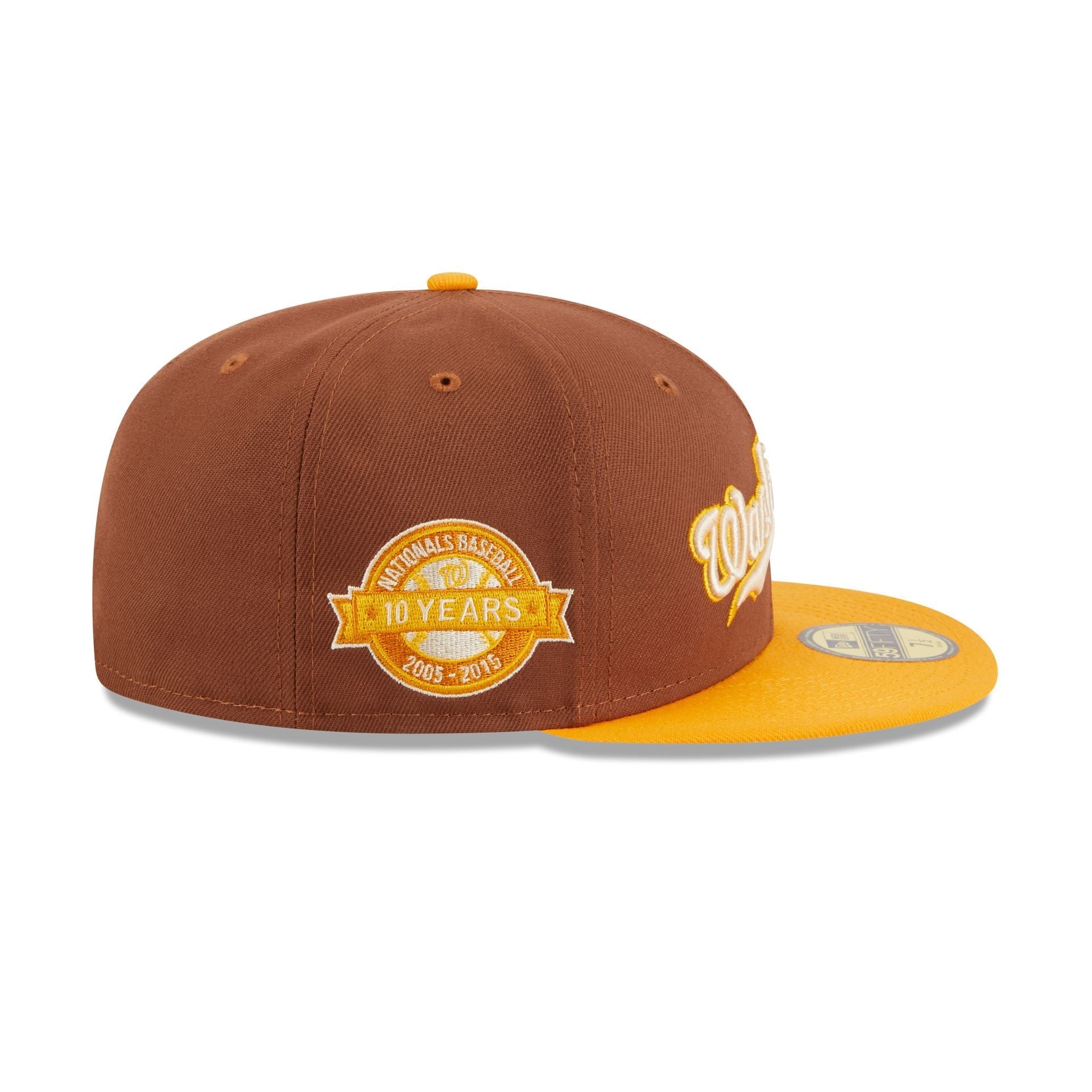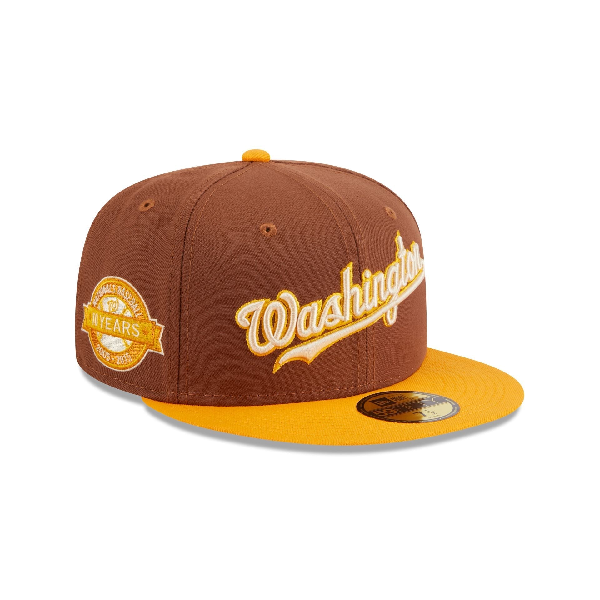 The Washington Nationals Tiramisu 59FIFTY Fitted Cap features an embroidered Nationals logo at the front panels with a matching MLB Batterman logo at the rear. Additional details include a 10 Years patch at the right-wear side and a gray undervisor.