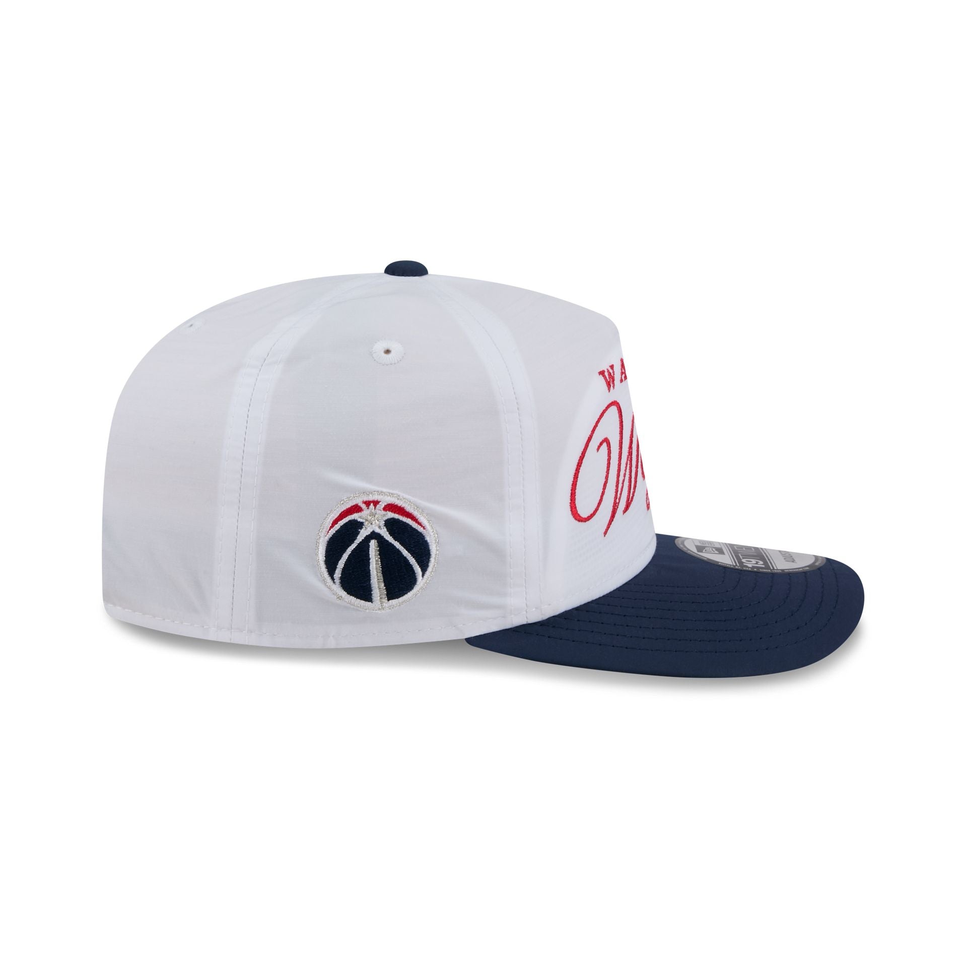 The Washington Wizards 2025 Draft 19TWENTY Adjustable Cap features an embroidered Wizards script wordmark at the front panels with a team logo at the right-wear side. Additional details include a woven silicone NBA Logoman patch above an adjustable buckle closure at the rear and a gray undervisor. The strap features a National Basketball Association gel print wordmark.