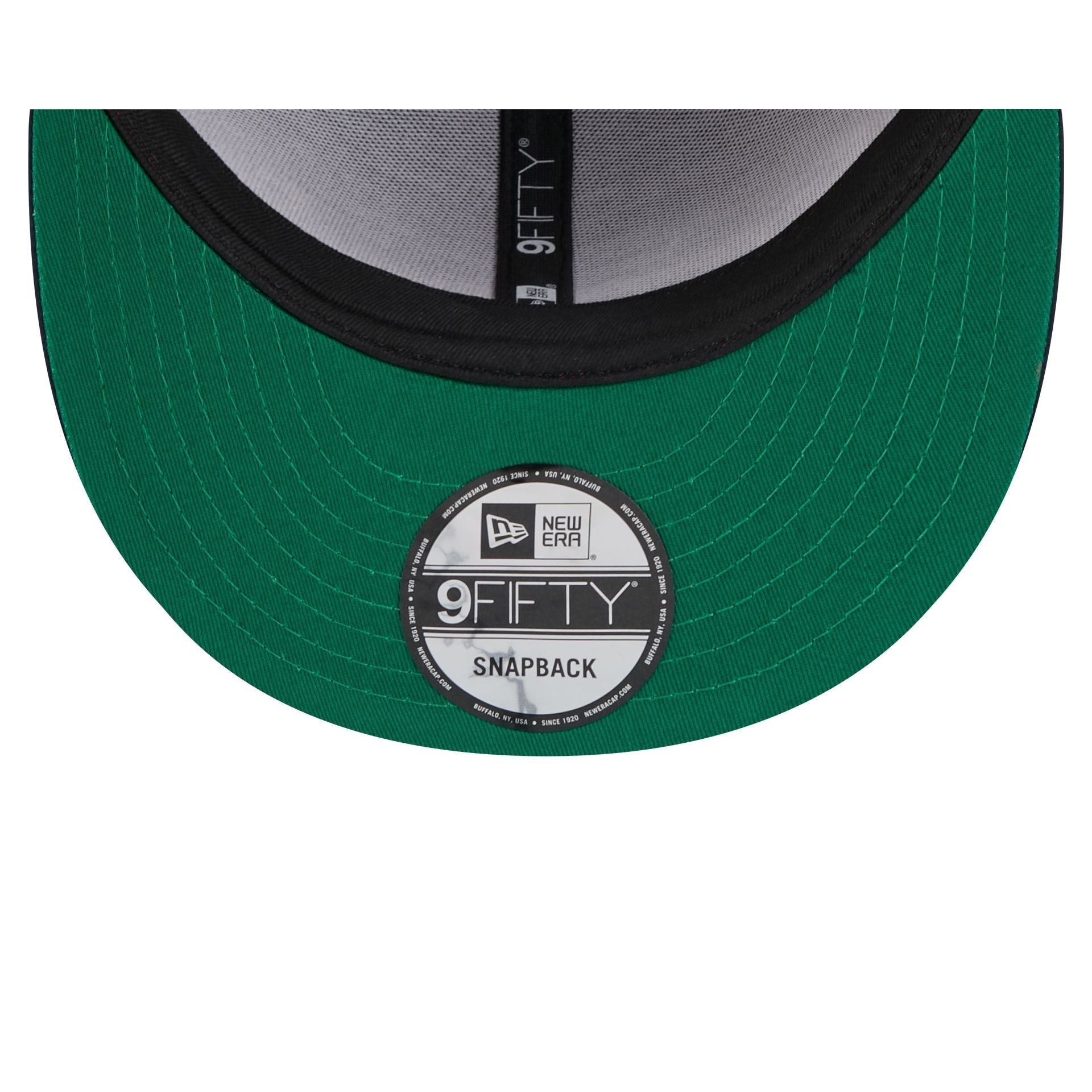 The Washington Wizards Satin Pin 9FIFTY Snapback features an embroidered Wizards wordmark at the front panels against a satin fabrication throughout the cap and a logo at the right-wear side. Additional details include a New Era Pin at the front left panel a snapback closure at the rear, and a green undervisor.