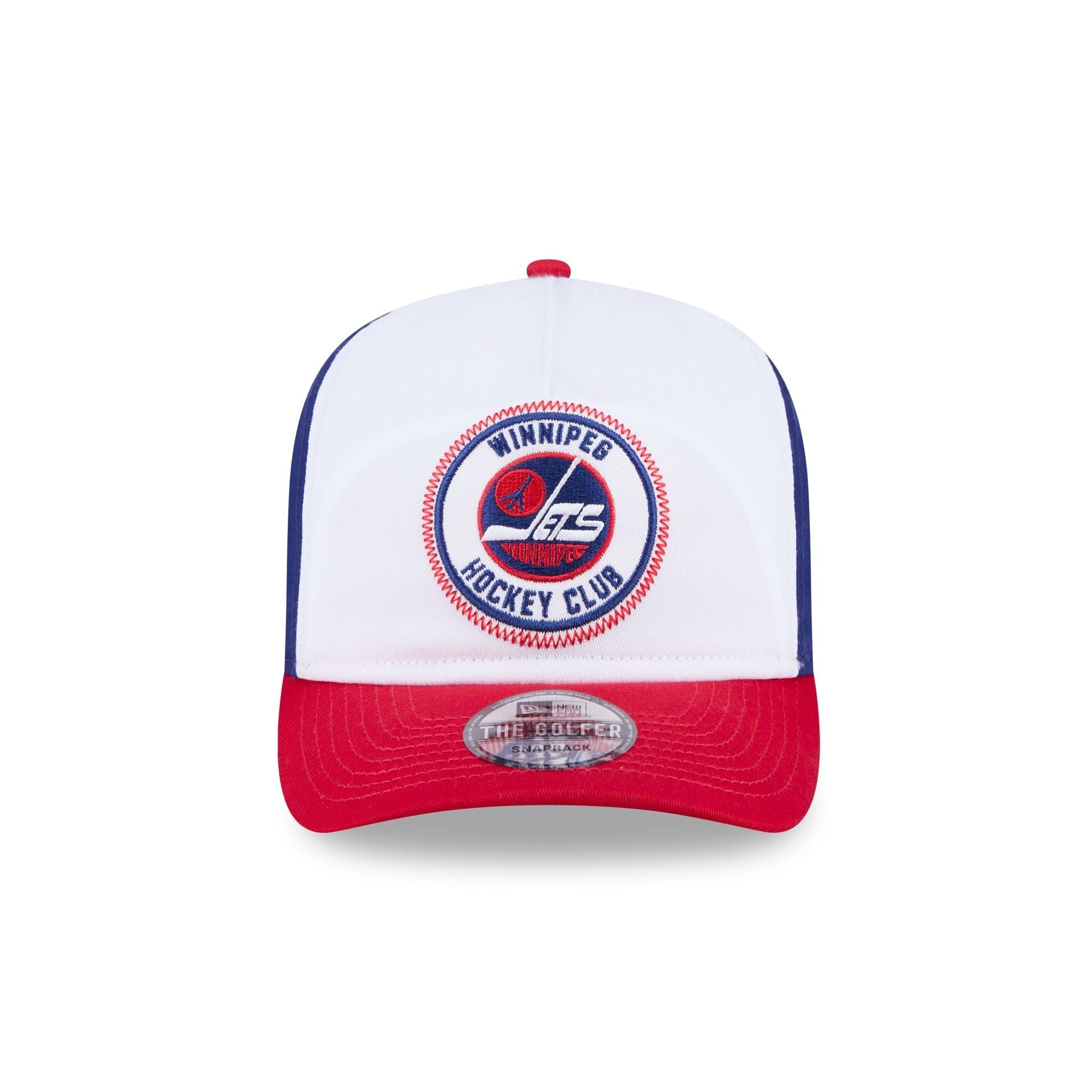 The Winnipeg Jets NHL Pack Golfer features a Jets Hockey Club patch at the front panel with a matching NHL Shield at the right of a snapback closure at the rear and a gray undervisor.