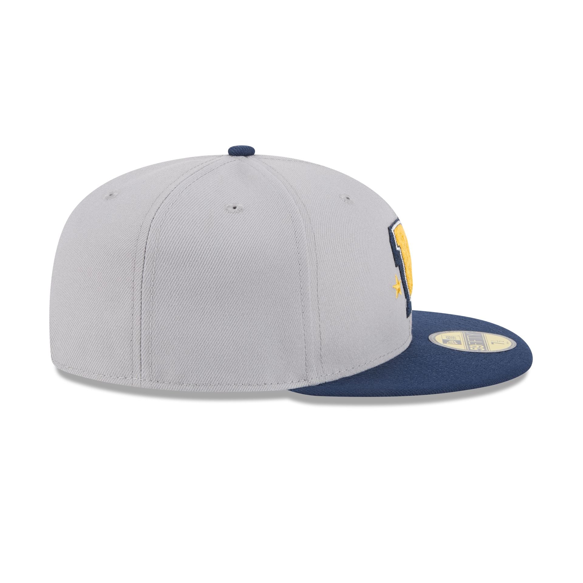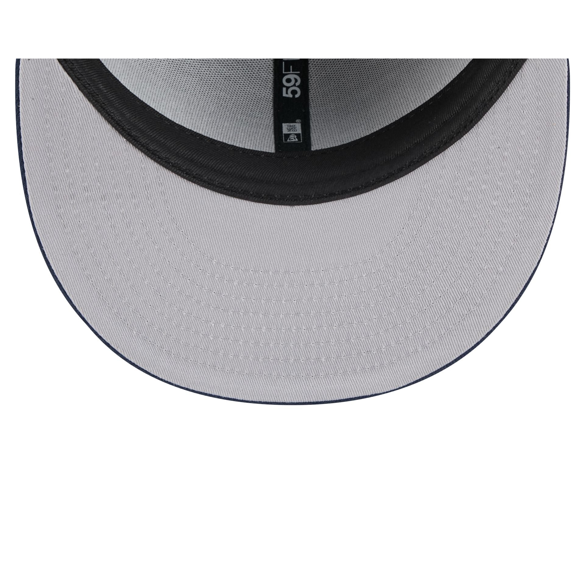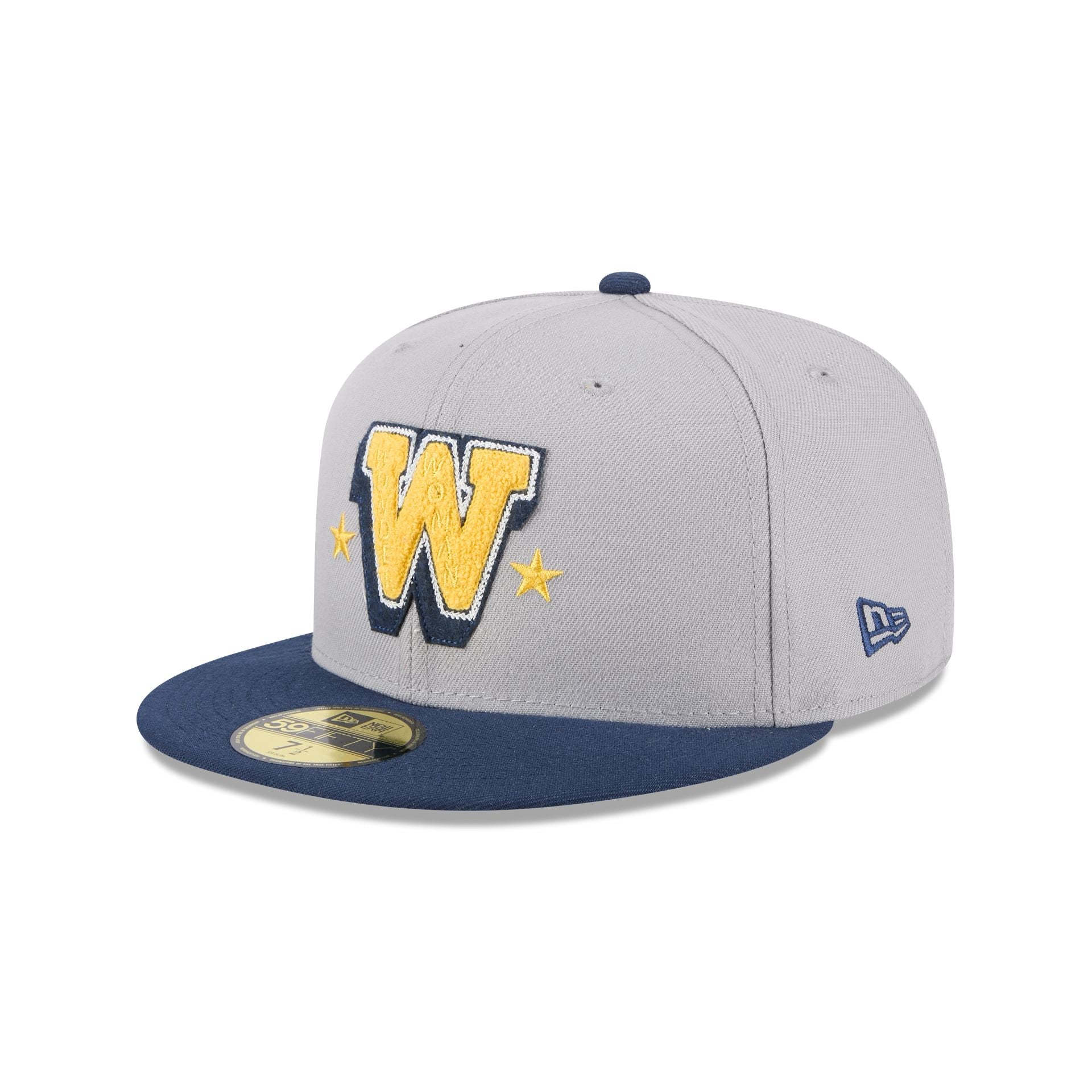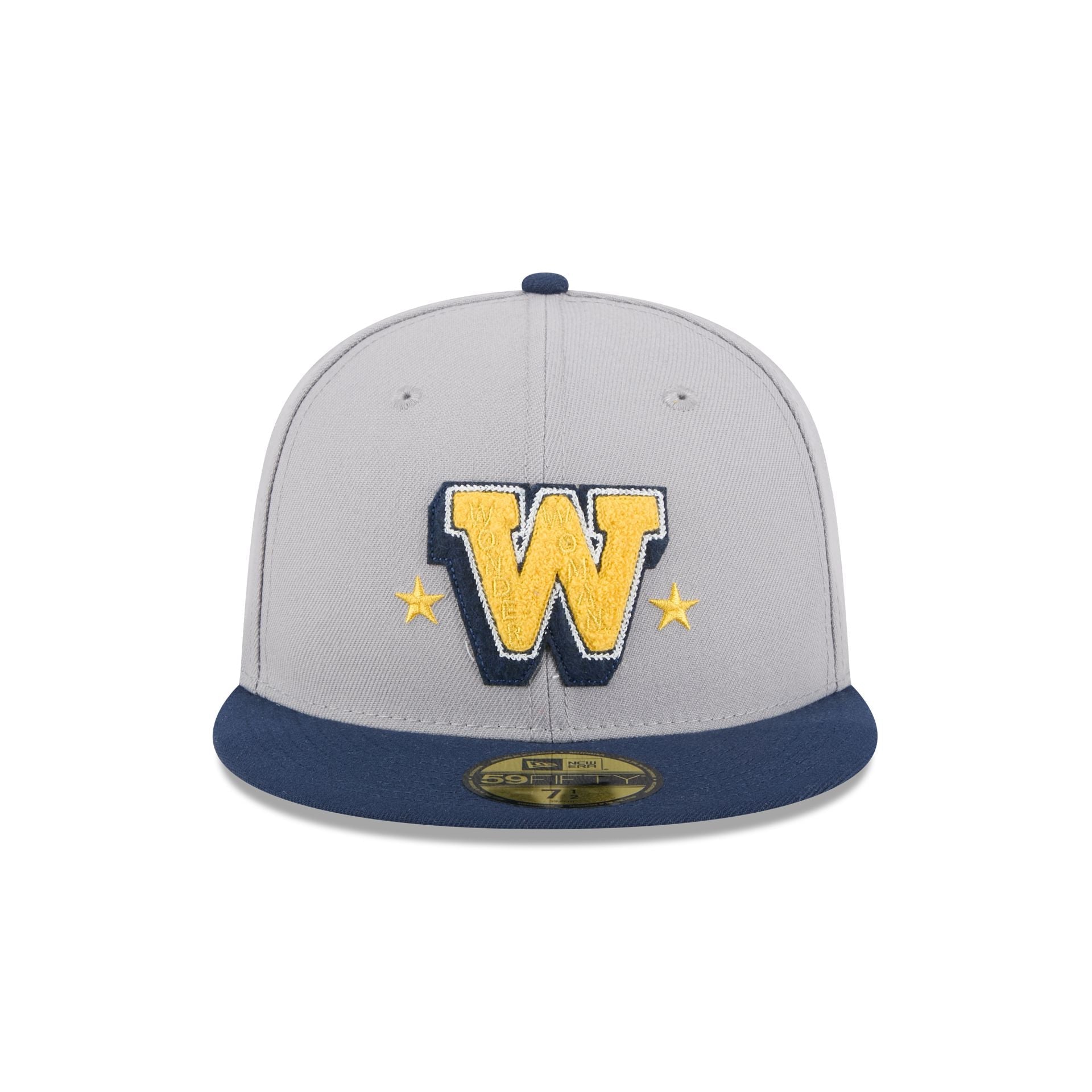 The Wonder Woman Gray 59FIFTY Fitted Cap features an embroidered Wonder Woman wordmark at a chenille applique W initial at the front panels with a matching logo at the rear, a navy visor, and a gray undervisor.